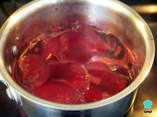 Descasque as beterrabas, corte em cubinhos e, numa panela à parte, coza também em água e um pouco de sal.
