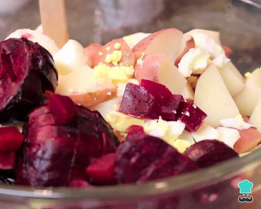 Quando as batatas e as beterrabas estiverem macias escorra a água. Descasque os ovos, corte em rodelas ou pique e coloque em uma tigela com as batatas e a beterraba. Adicione maionese a gosto e misture tudo.