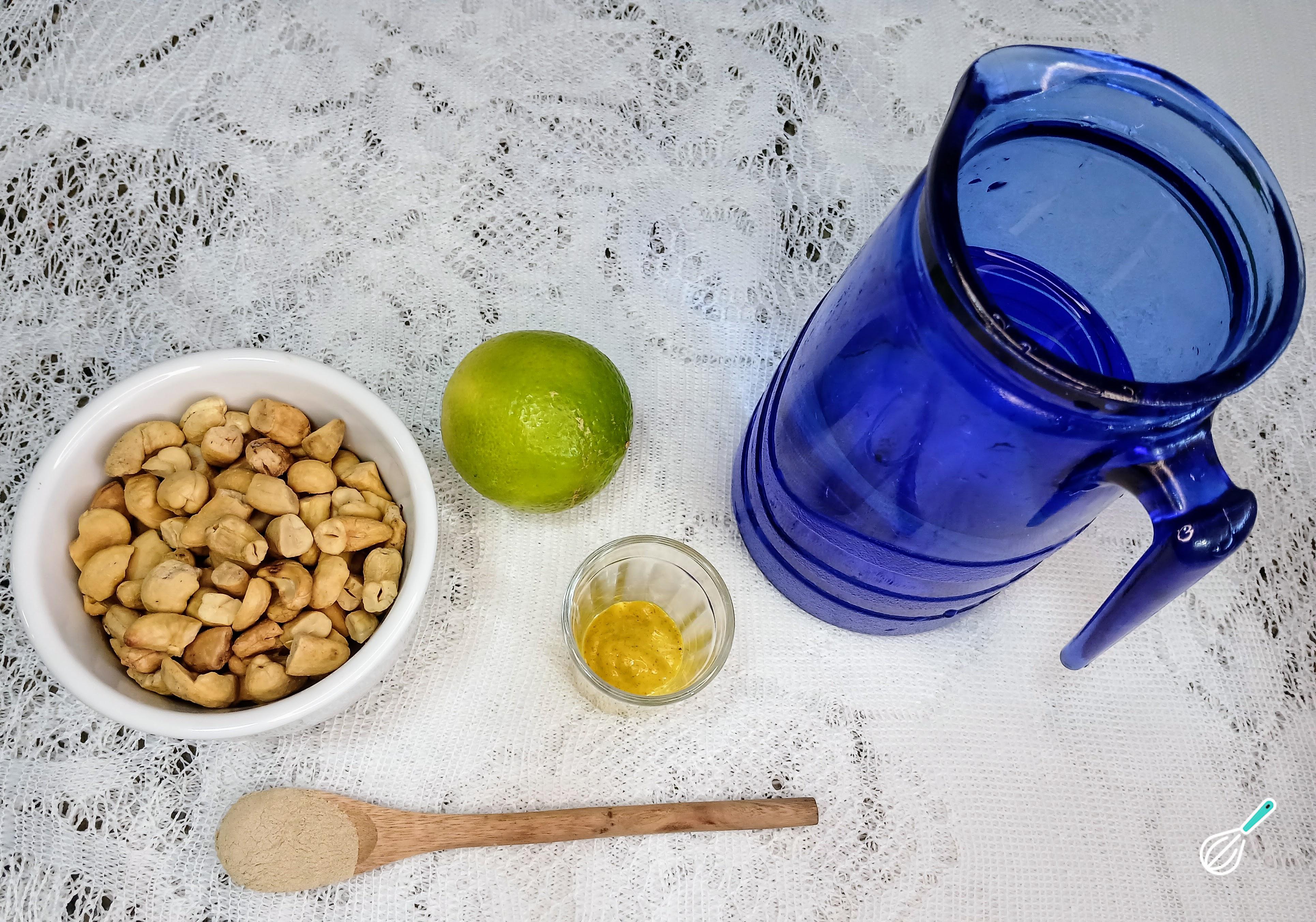 Comece separando os ingredientes para o preparo da maionese de castanha-de-caju. Separe as castanhas de caju, o limão, a água, o alho em pó e a mostarda amarela.