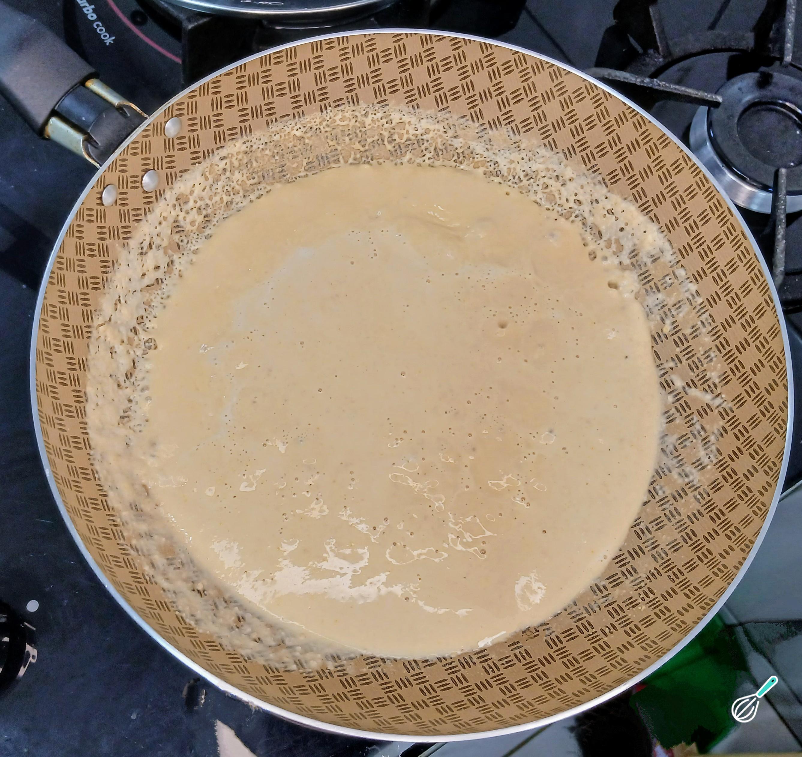 Feito isso, transfira o conteúdo do liquidificador para uma panela média. Em fogo baixo deixe cozinhar para encorpar.