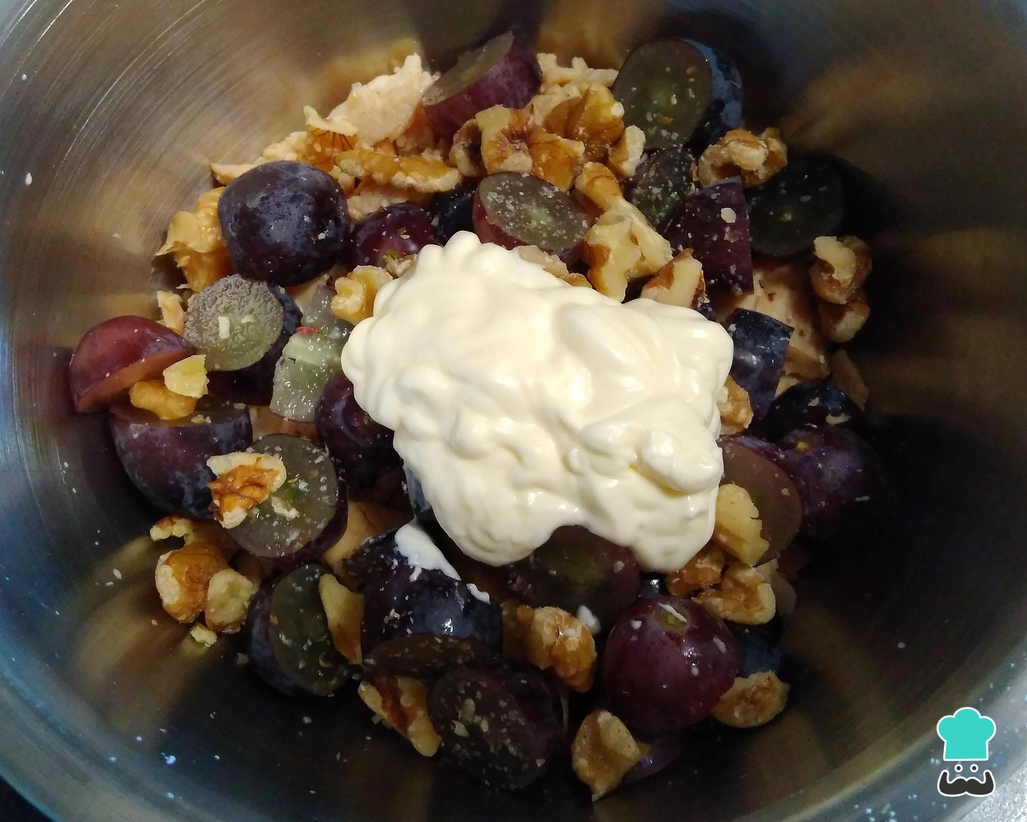 Pique ou fatie as uvas, dependendo do tamanho delas, e coloque no bowl. Adicione também as nozes picadas e a maionese.