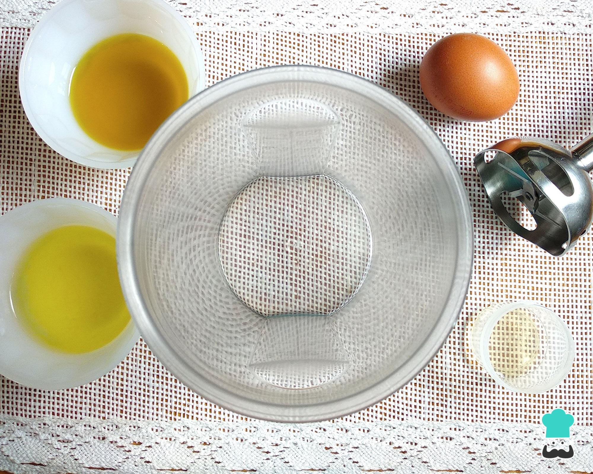 Junte na bancada ou na mesa os ingredientes necessários ao preparo desta receita de maionese caseira no mixer. Outra opção é fazer a maionese no liquidificador, o preparo é igual.