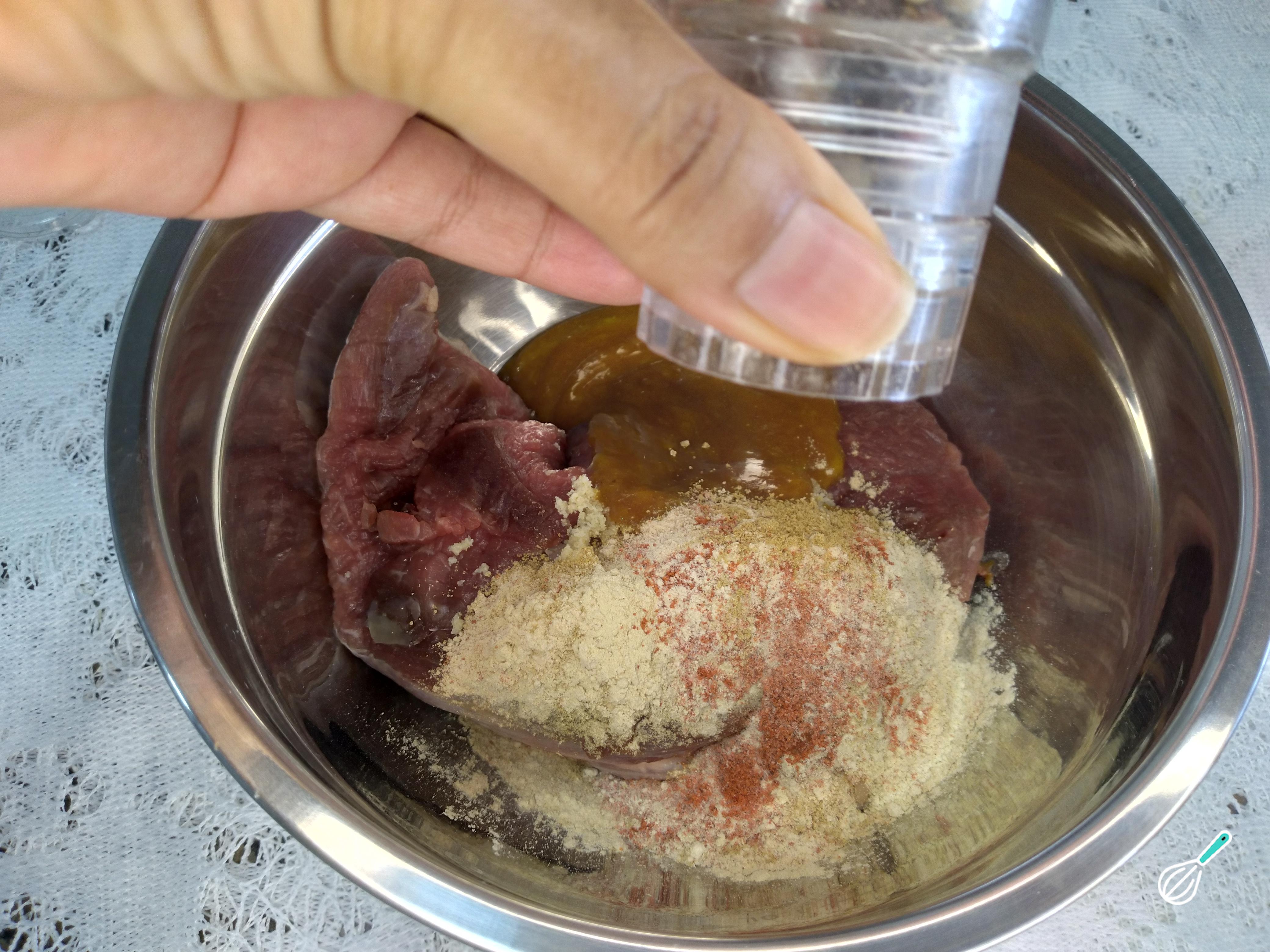 Coloque-a dentro de um bowl e acrescente o molho barbecue, a mostarda amarela, o temperos de sua preferência, sal e pimenta.