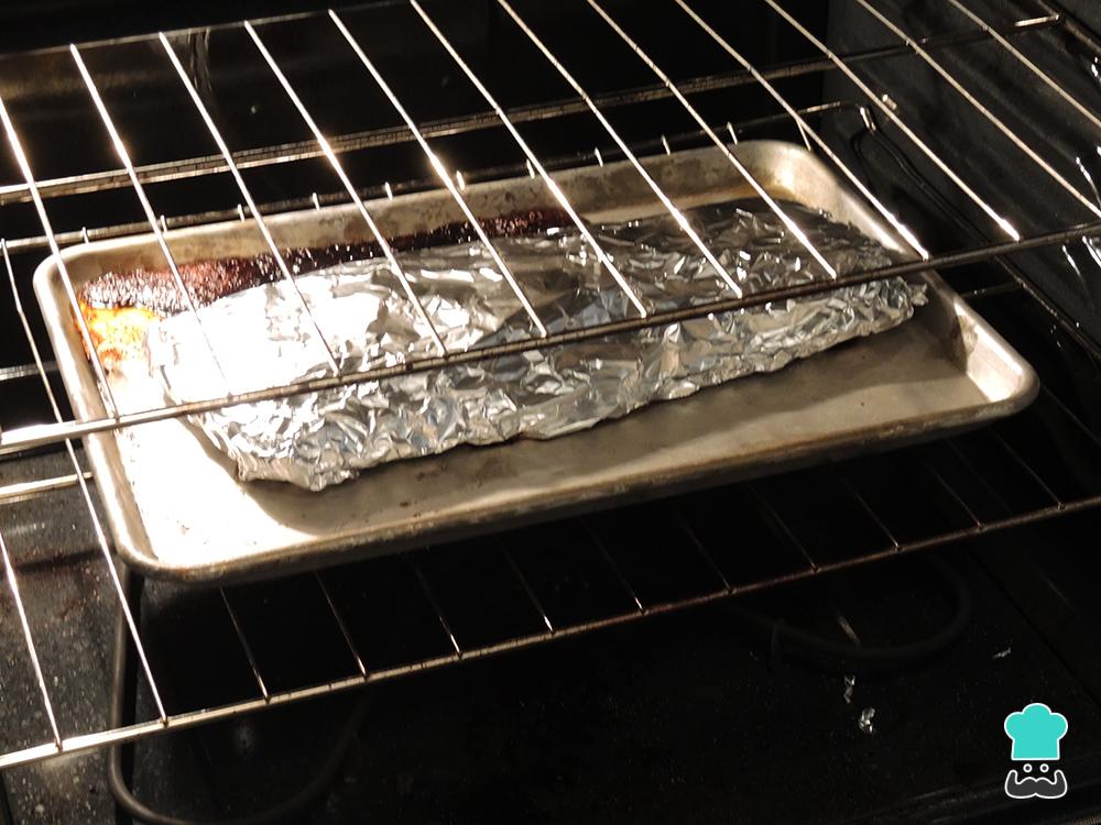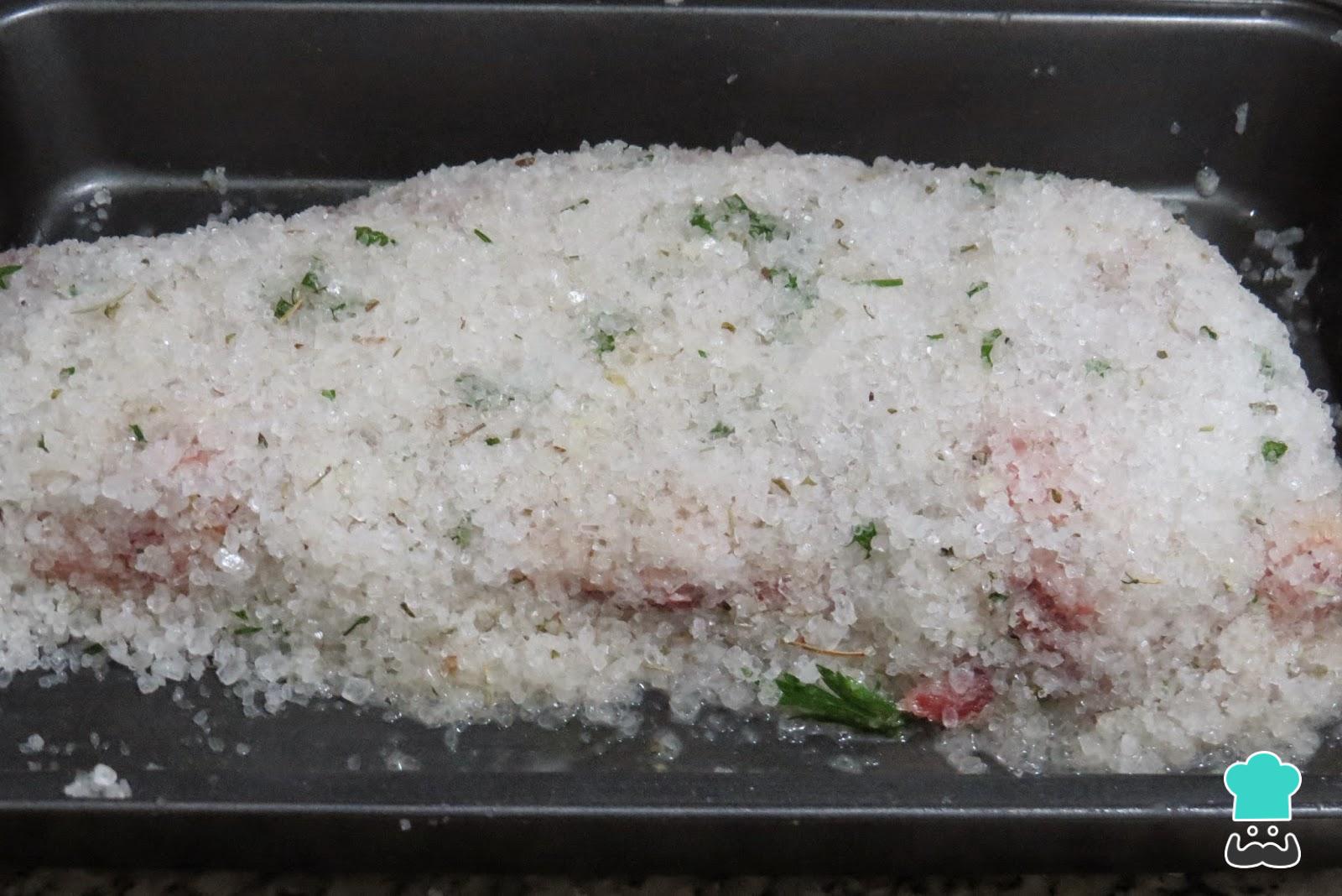 De seguida, cubra a carne com sal grosso e asse em forno preaquecido a 200 º C por 50 minutos. Remova o papel-alumínio e deixe dourar por mais 10 minutos no forno. Retire a maminha assada do forno e remova todo o sal.