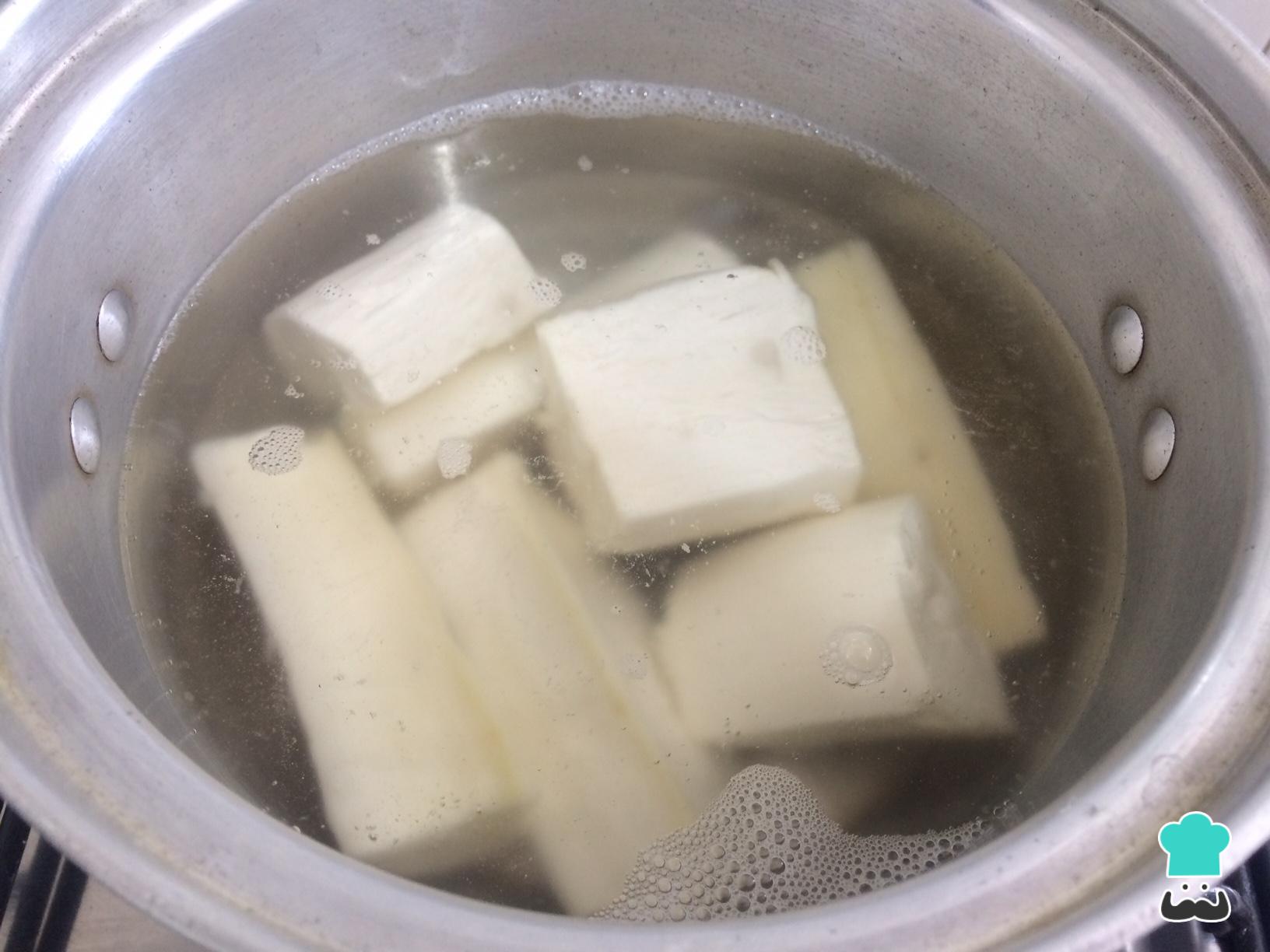 Descasque a mandioca e corte em pedaços. Coloque os pedaços de mandioca em uma panela com água fervente e deixe cozinhar por uma hora.