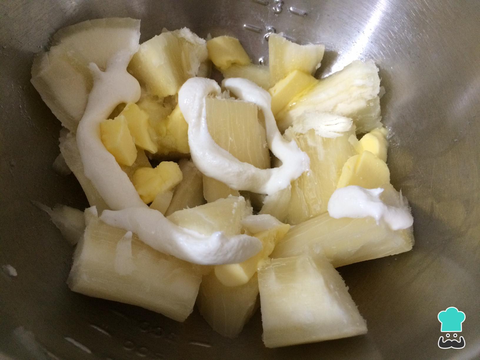 Retire a mandioca da panela com água e triture-a logo em seguida com manteiga cortada em pedaços e com o creme azedo. Quando tiver um purê suave, tempere com sal e pimenta.