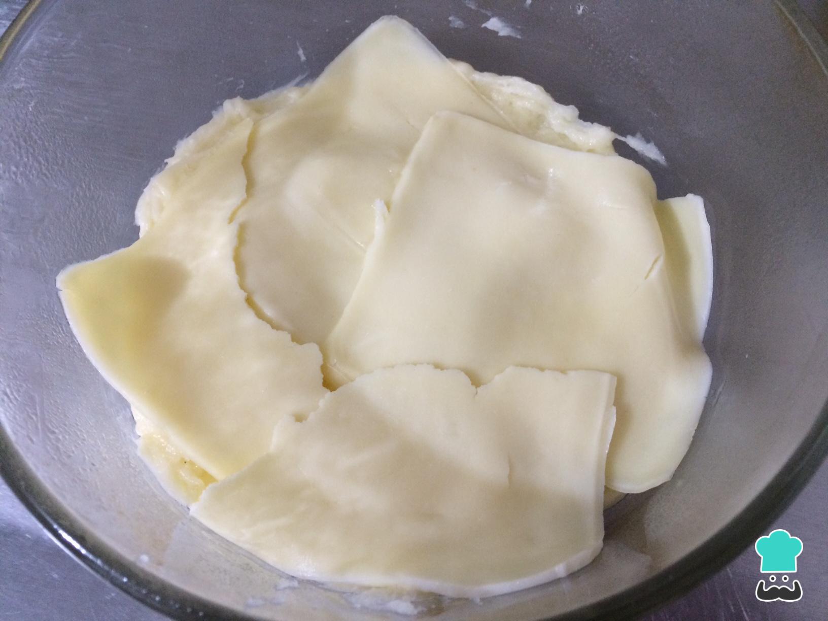 Coloque o puré de mandioca numa forma previamente untada e sobre ele disponha as fatias de queijo. Em seguida, leve a mandioca com queijo ao forno, a 180°C por 10 minutos ou até o queijo derreter.