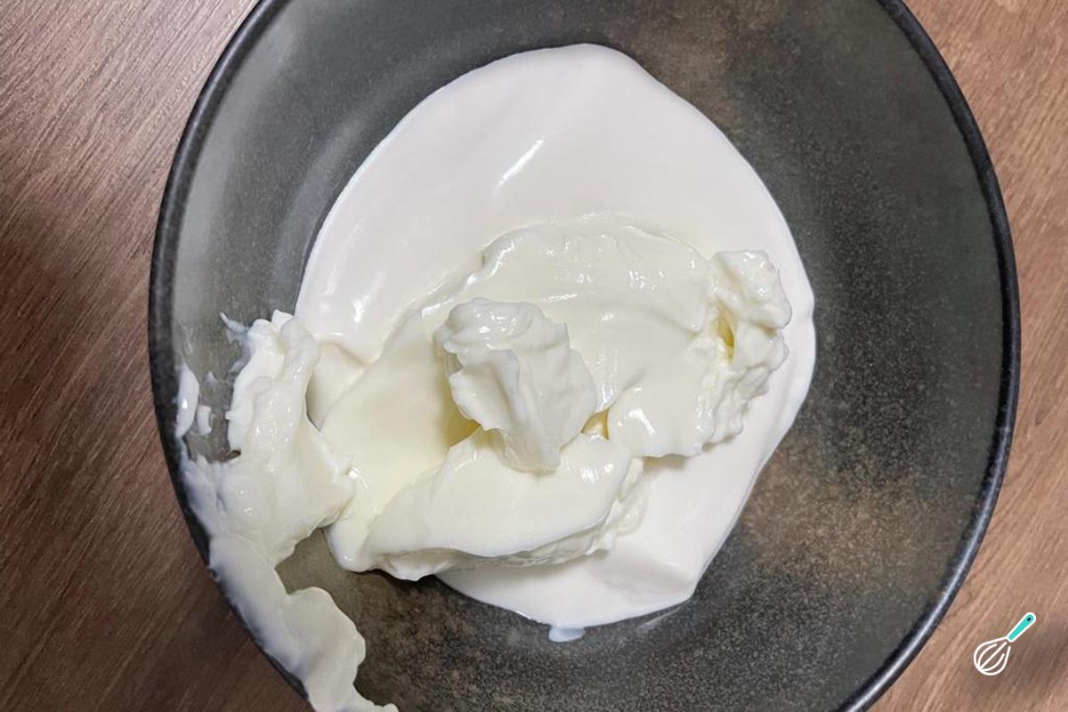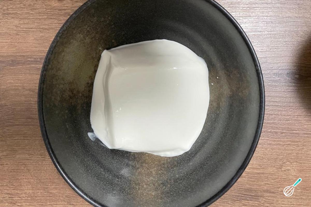 Numa tigela, coloque o creme de leite (aqui foi usado o de caixinha. Caso prefira utilizar o creme de leite em lata, descarte o soro).