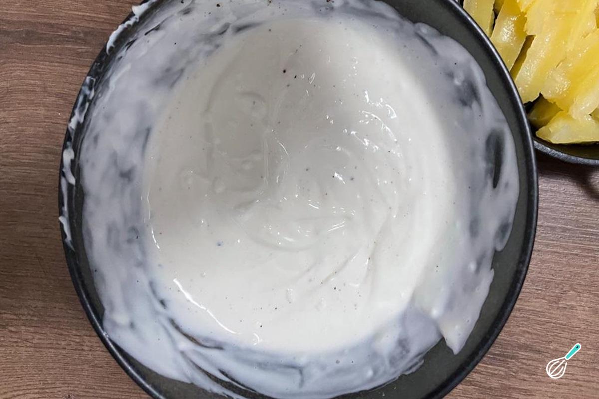 Tempere com sal e pimenta-do-reino preta moída. Se preferir, pode adicionar outros temperos como: como noz-moscada, alho e cebola em pó. Misture bem até obter um creme homogêneo.