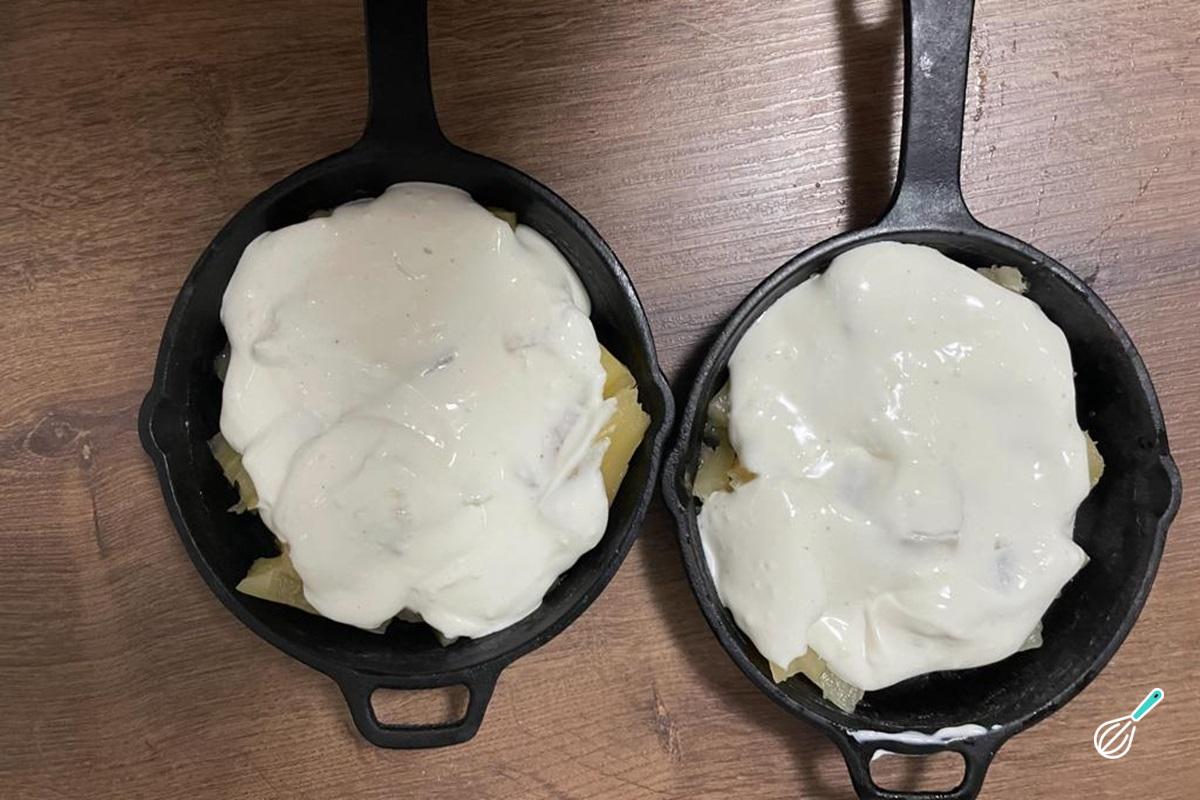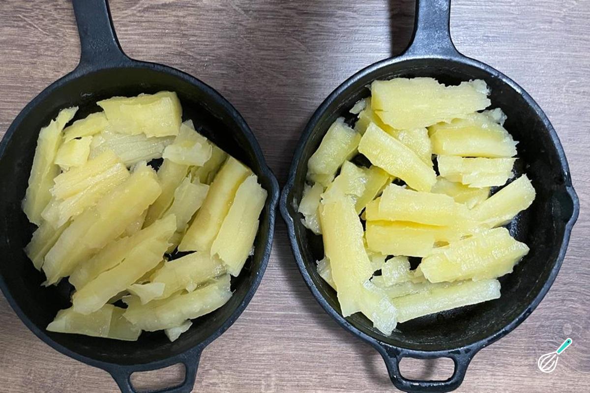 Coloque a mandioca cozida em uma panela, frigideira ou refratário que possa ir ao forno. Caso você não tenha temperado a mandioca com sal durante o cozimento, neste momento você pode temperar com um pouco de sal, lembrando que o creme e o queijo já são salgados.