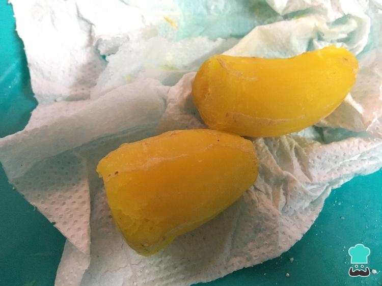 Lave as batatas, descasque e enrole em um papel toalha duas batatas de cada vez. Dê uma leve molhada no papel e leve no microondas 2 minutos e meio para cozinhar.
