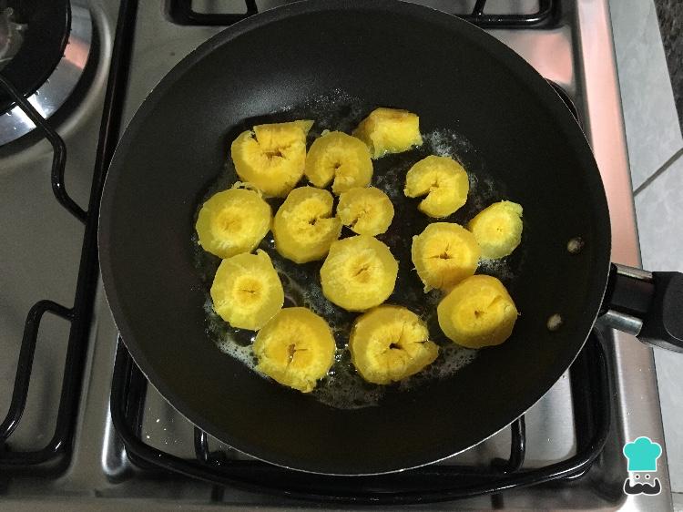 Corte as batatas em rodelas grossas, arrume na frigideira e jogue uma pitada de sal.