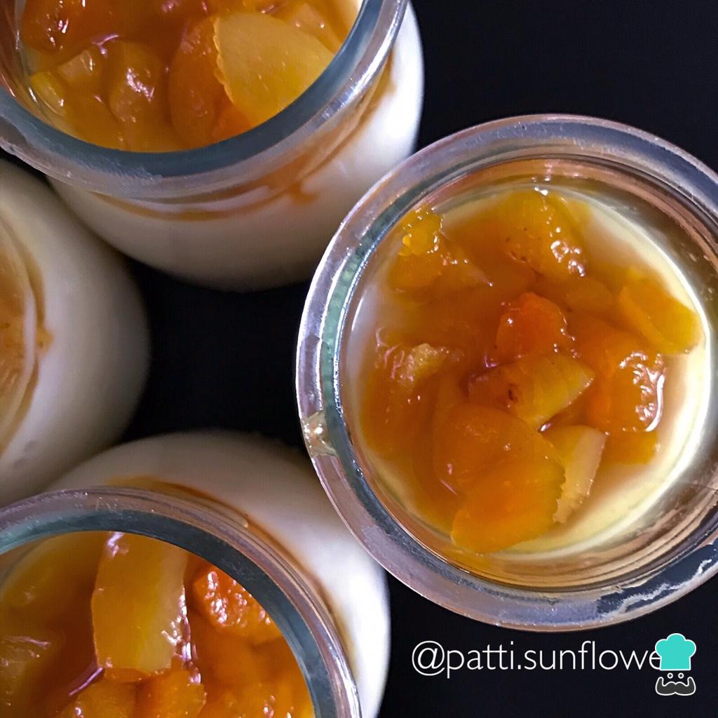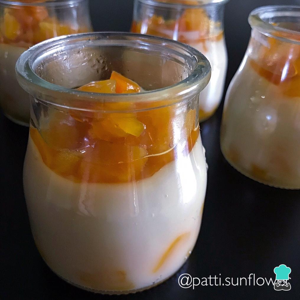 O ponto para o manjar vegano de coco com damasco no potinho é esse da foto: passou o dedo no fundo da colher e o creme não voltou a se tocar, está pronto!