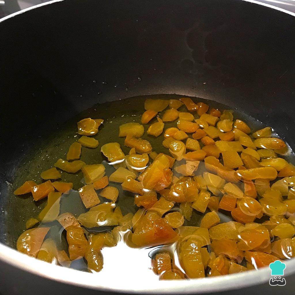 Prepare a calda de damasco misturando o damasco picado com o xarope de borde (1 1/2 colher de sopa) e a água. Deixe ferver até reduzir pela metade, então desligue o fogo e reserve.