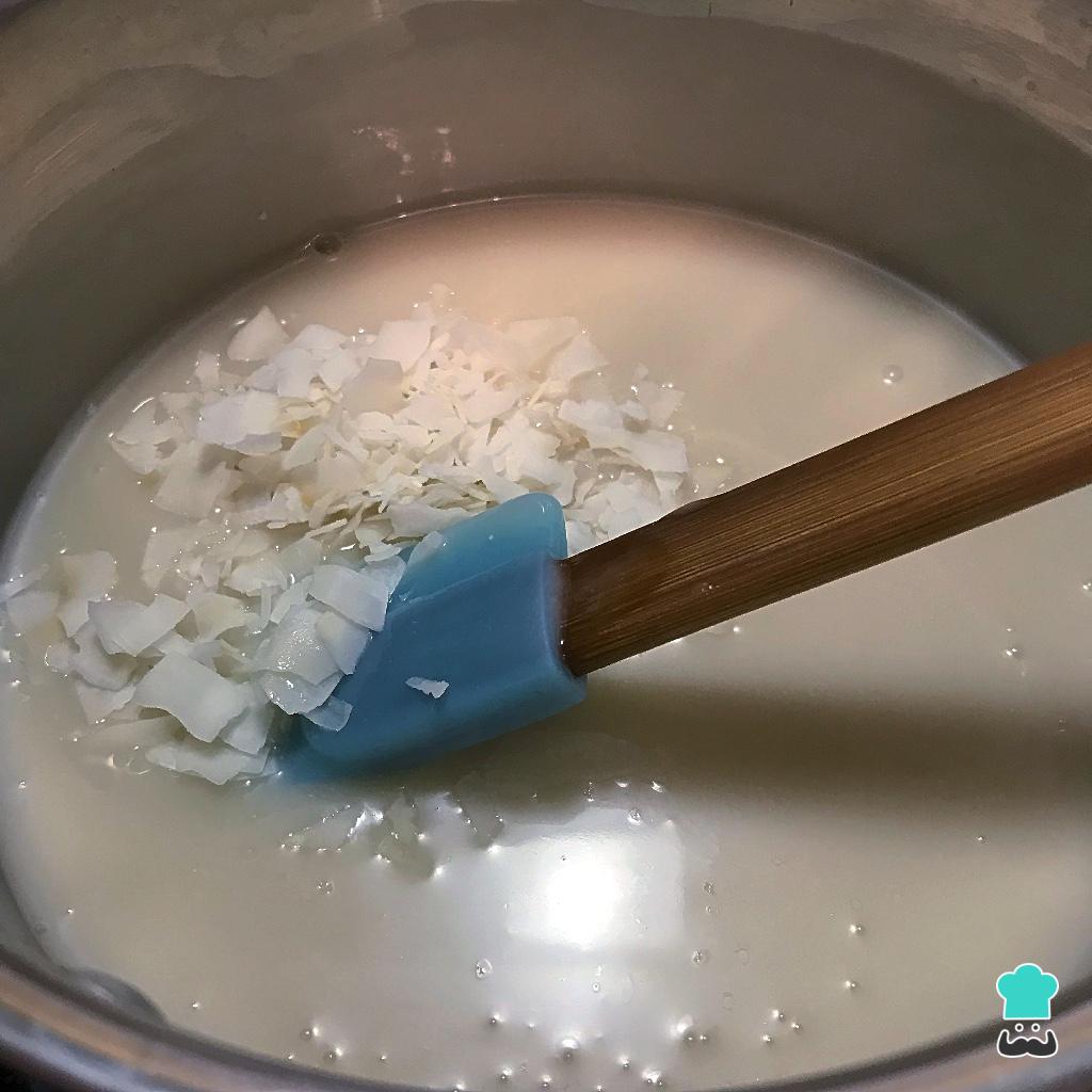 Misture as lascas de coco e cozinhe por mais 2 ou 3 minutos, mexendo sempre.