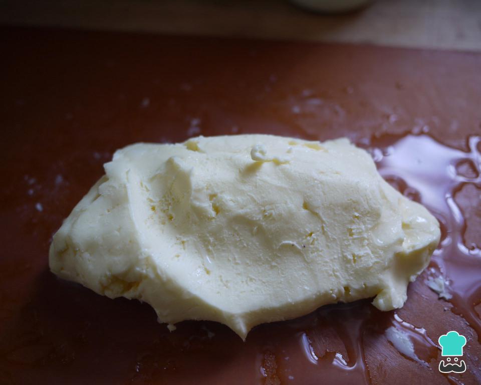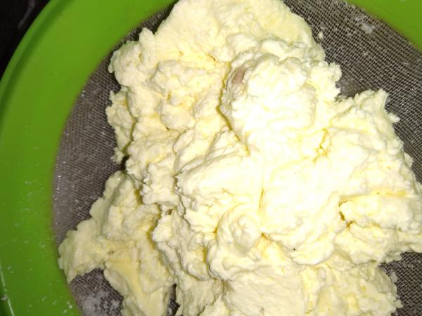 Modelar a parte sólida em forma de bola, colocar num recipiente com água e gelo e pressionar com as mãos, para soltar o máximo de soro possível. Repetir o procedimento trocando a água da tigela até que fique transparente.