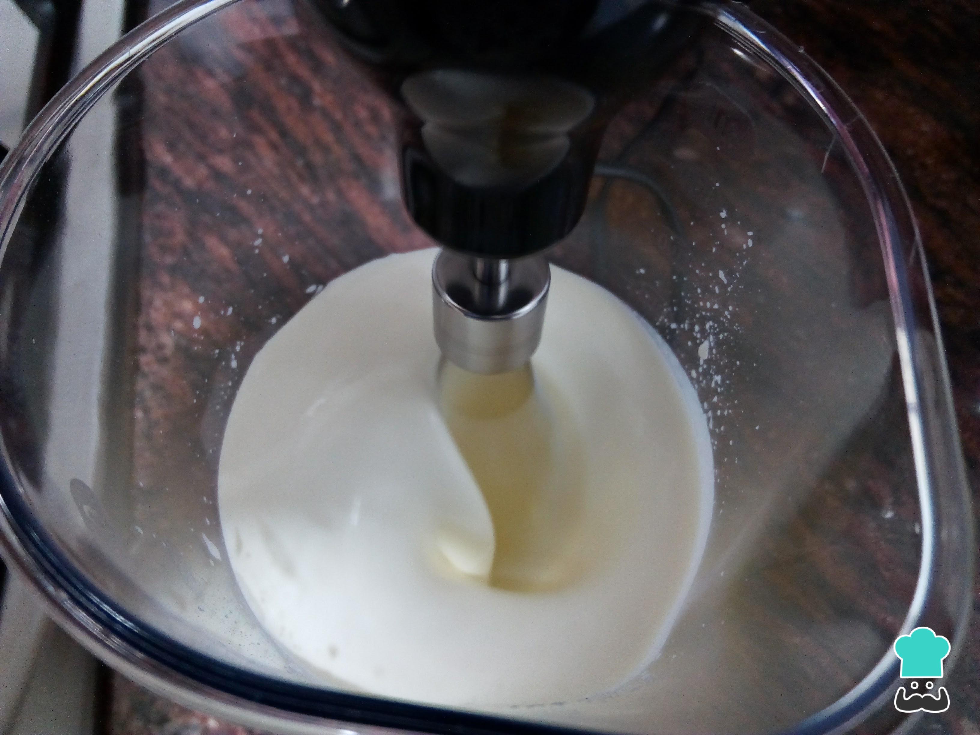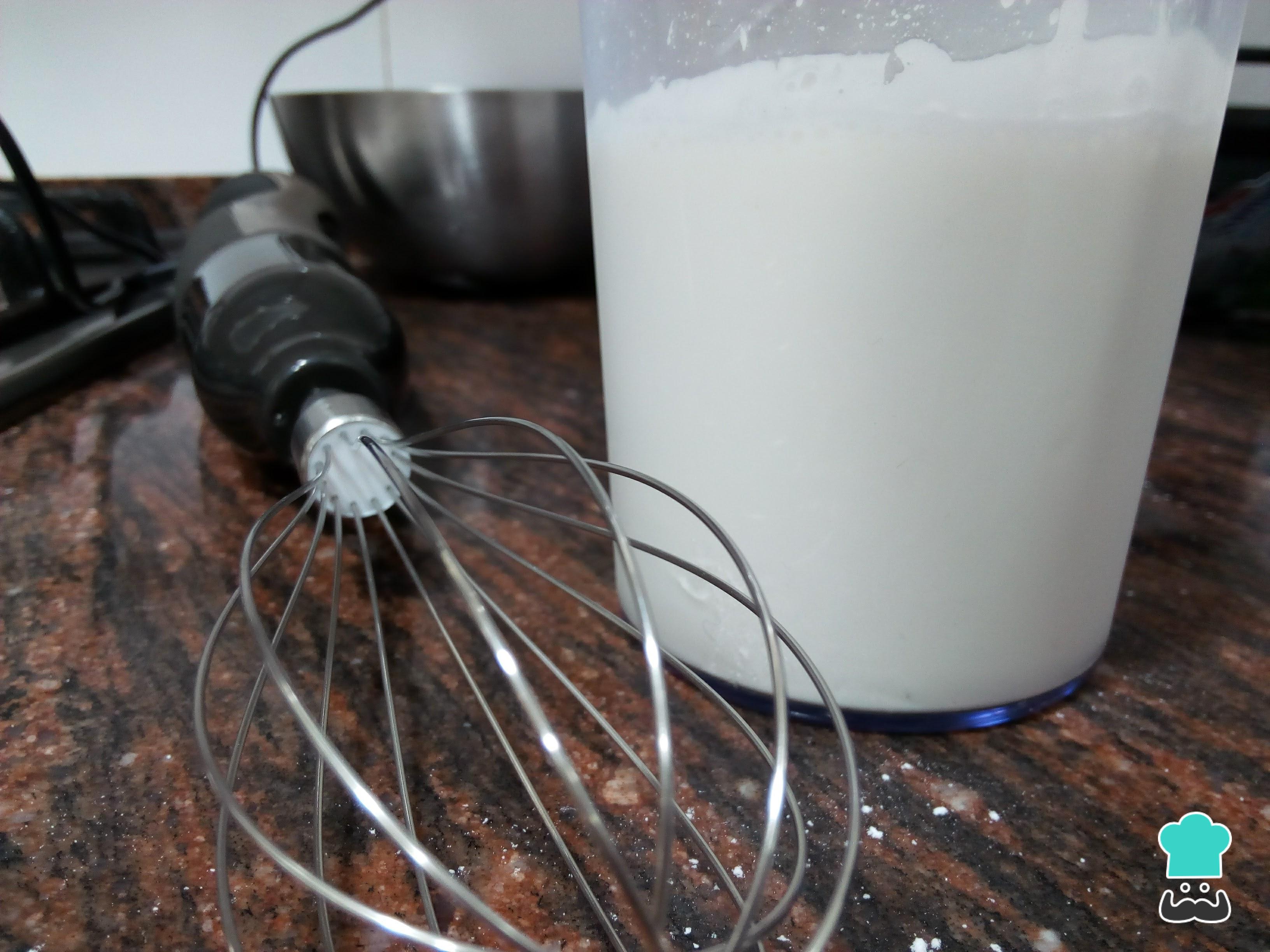 Coloque a nata ou o creme de leite no bowl da batedeira, no liquidificador ou num copo alto, caso prefira usar o mixer de mão. Comece batendo em velocidade baixa.