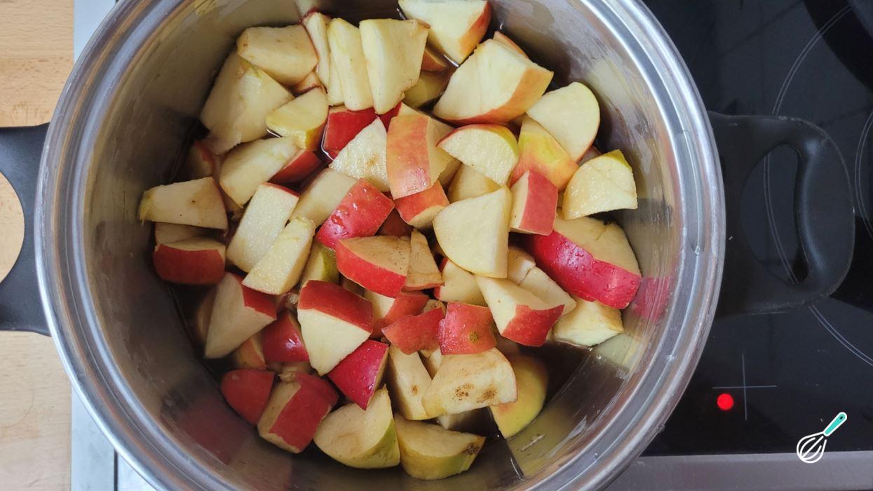 Em uma panela, coloque as maçãs, o açúcar, a água, a cidra e as especiarias. Se for substituir a cidra ou suco de maçã por água, utilize o suco de 1 limão para trazer acidez.