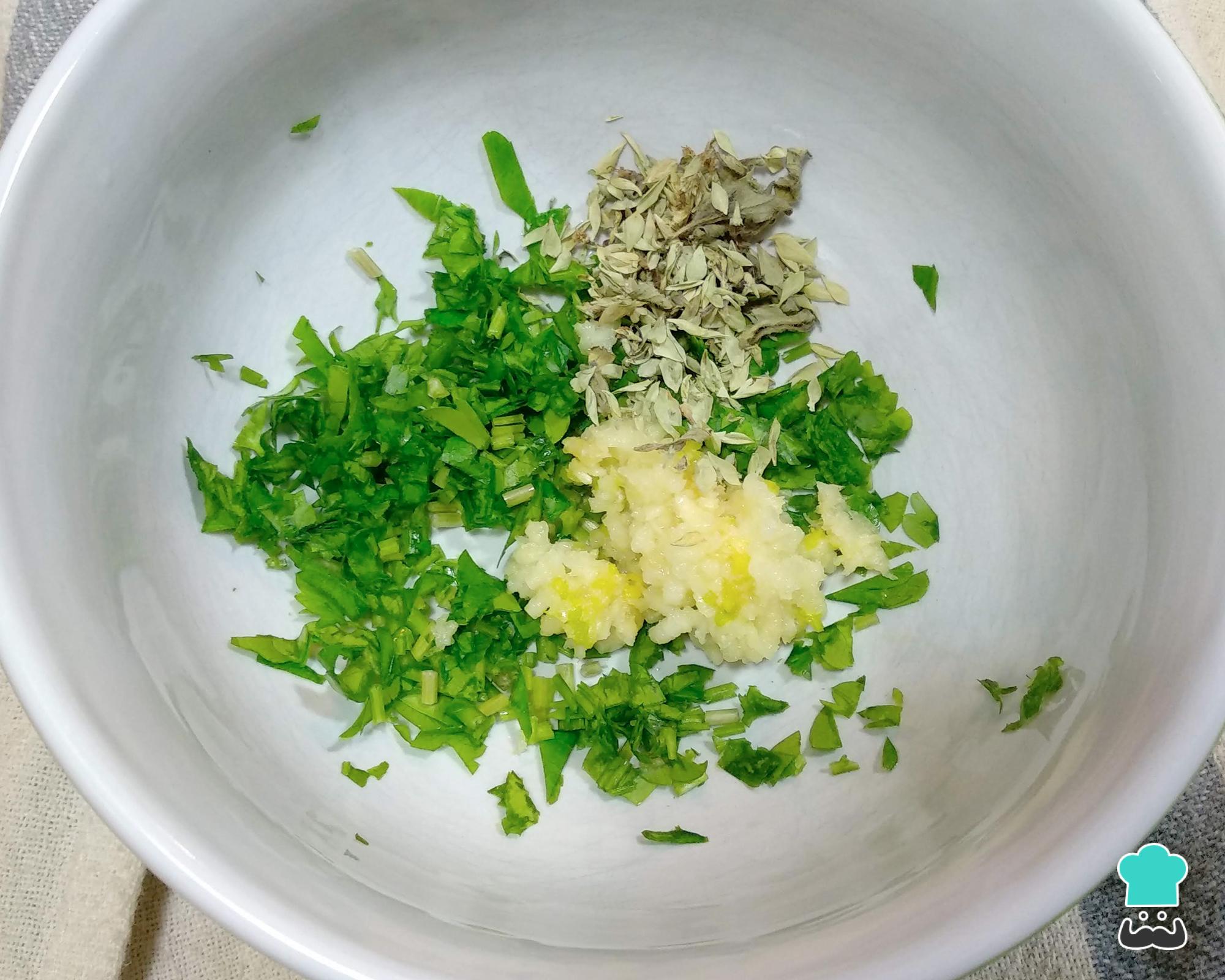 Numa tigela coloque os temperos da manteiga: a salsinha, os oréganos, e os dentes de alho amassados ou picados finamente. Misture.