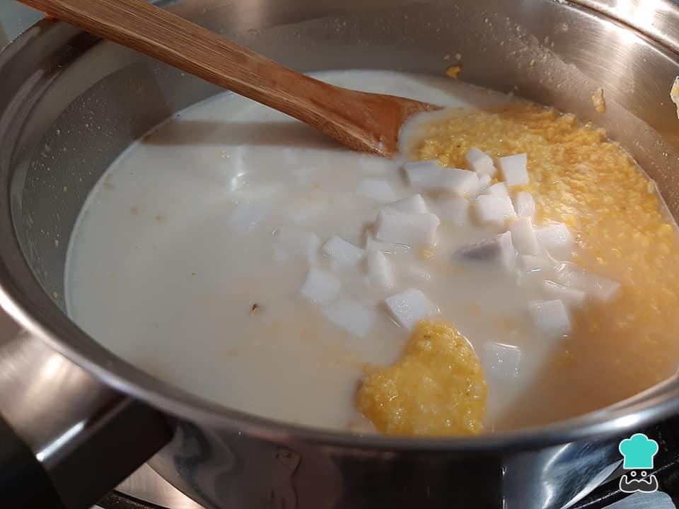 Numa panela média adicione o leite de coco, o flocão de milho, o açúcar, a pitada de sal e os pedacinhos de coco, misturando bem.