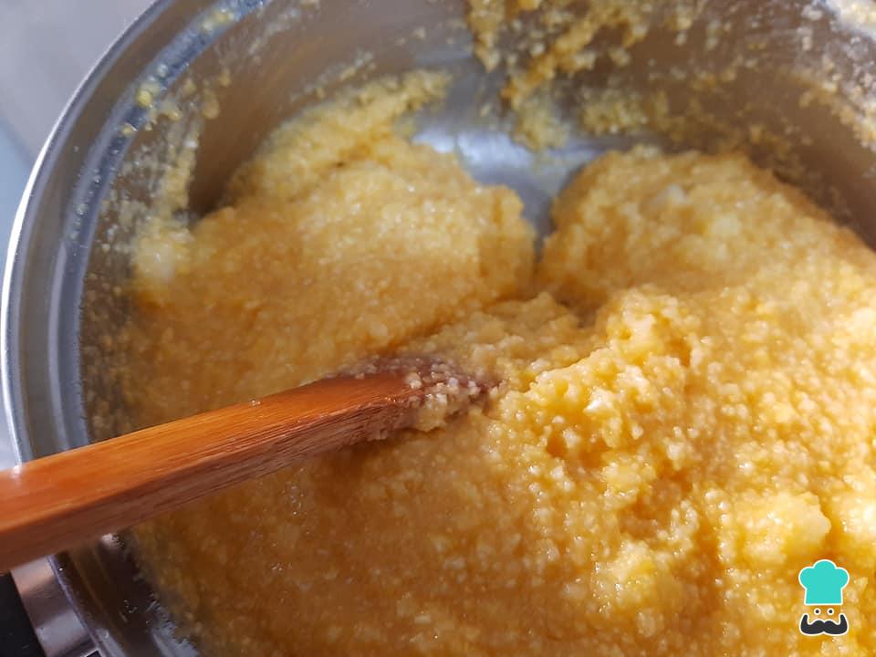 Cozinhe em fogo médio, mexendo sem parar até ficar com consistência de pirão e começar a desgrudar do fundo da panela.