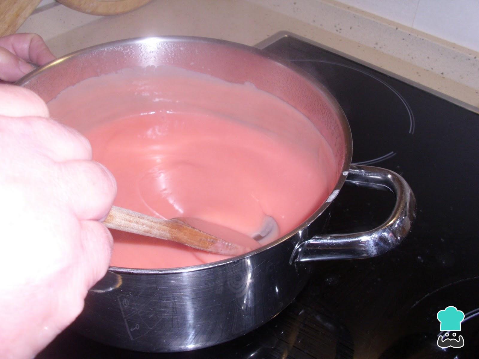 Para fazer pudim maria-mole de morango, comece por dissolver a maria-mole em água fervente. Espere que esfrie e, aos poucos, junte o leite condensado.