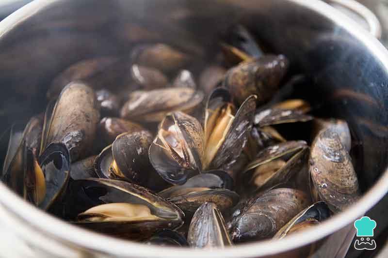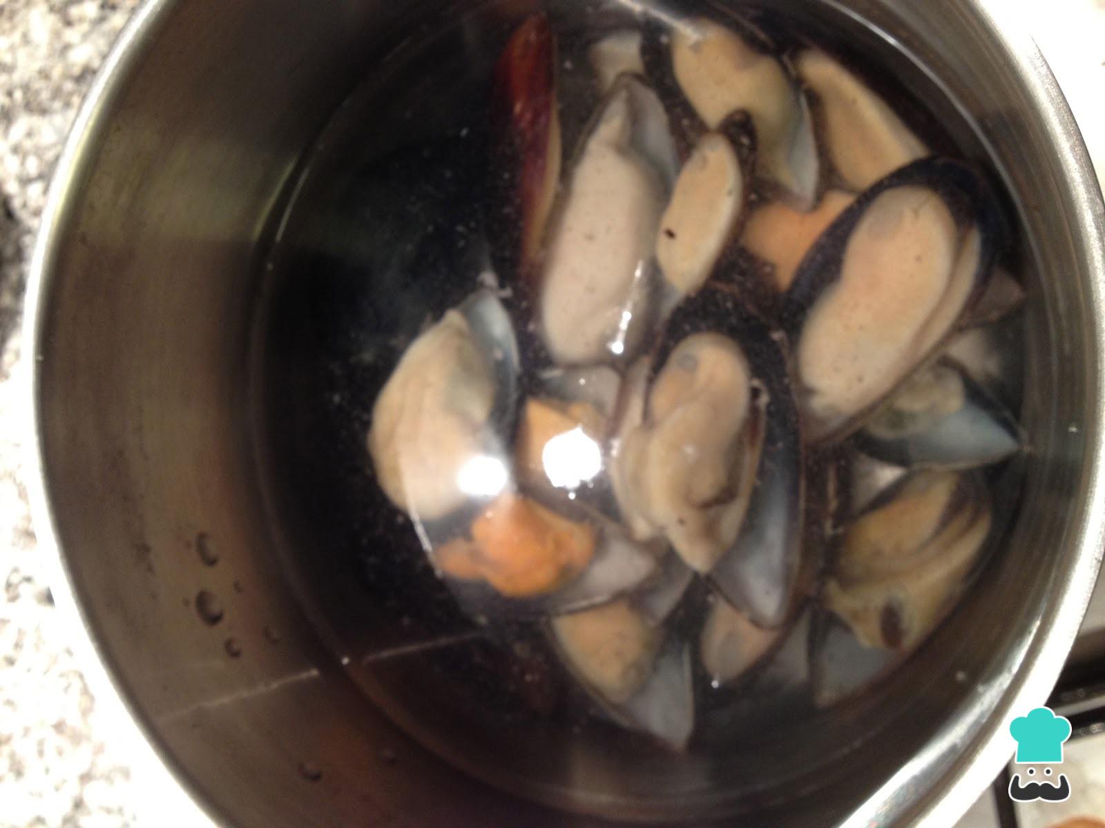 Para fazer marisco ao bafo, comece por colocar os mariscos em uma panela com água (até cobrir) e sal.