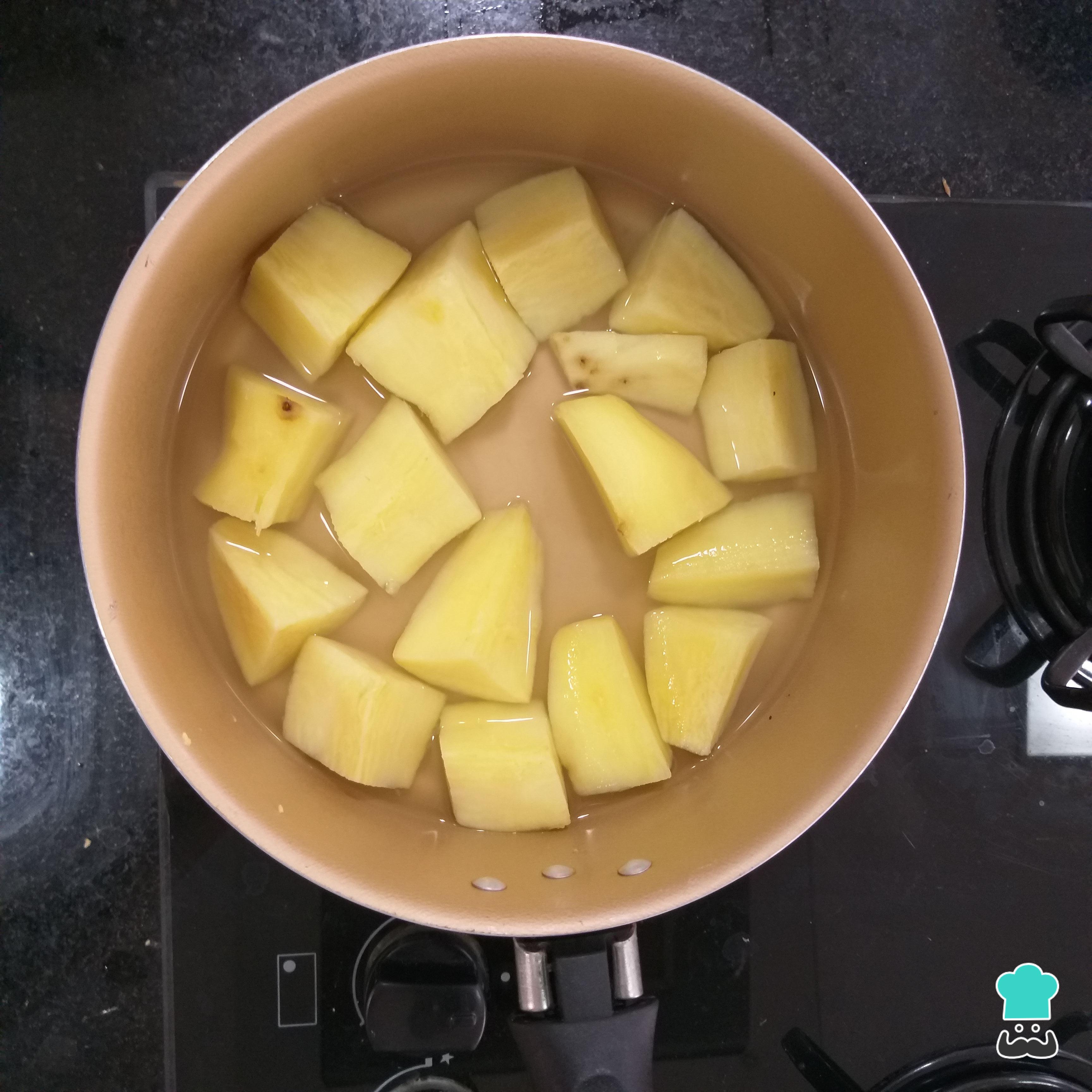 Descasque e corte a batata doce em cubos. Coloque em uma panela, cubra com água, adicione um pouco de sal e leve ao fogo médio até que as batatas fiquem macias.