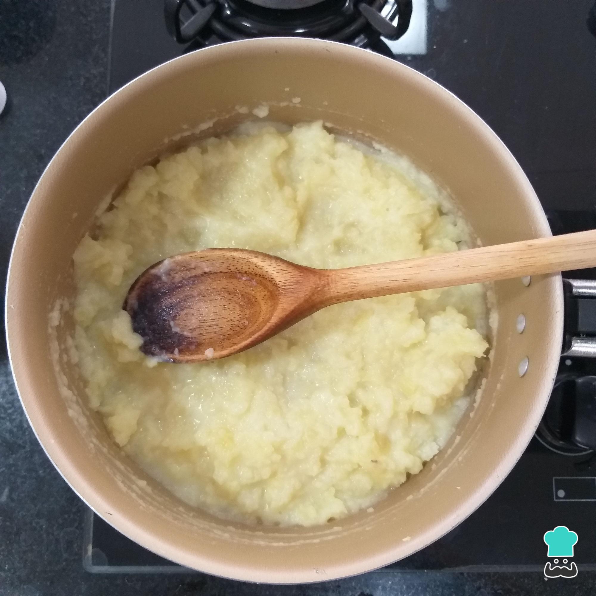 Escorra a água, amasse as batatas e volte para a panela com manteiga, sal e leite. Cozinhe até obter uma mistura homogênea e reserve.