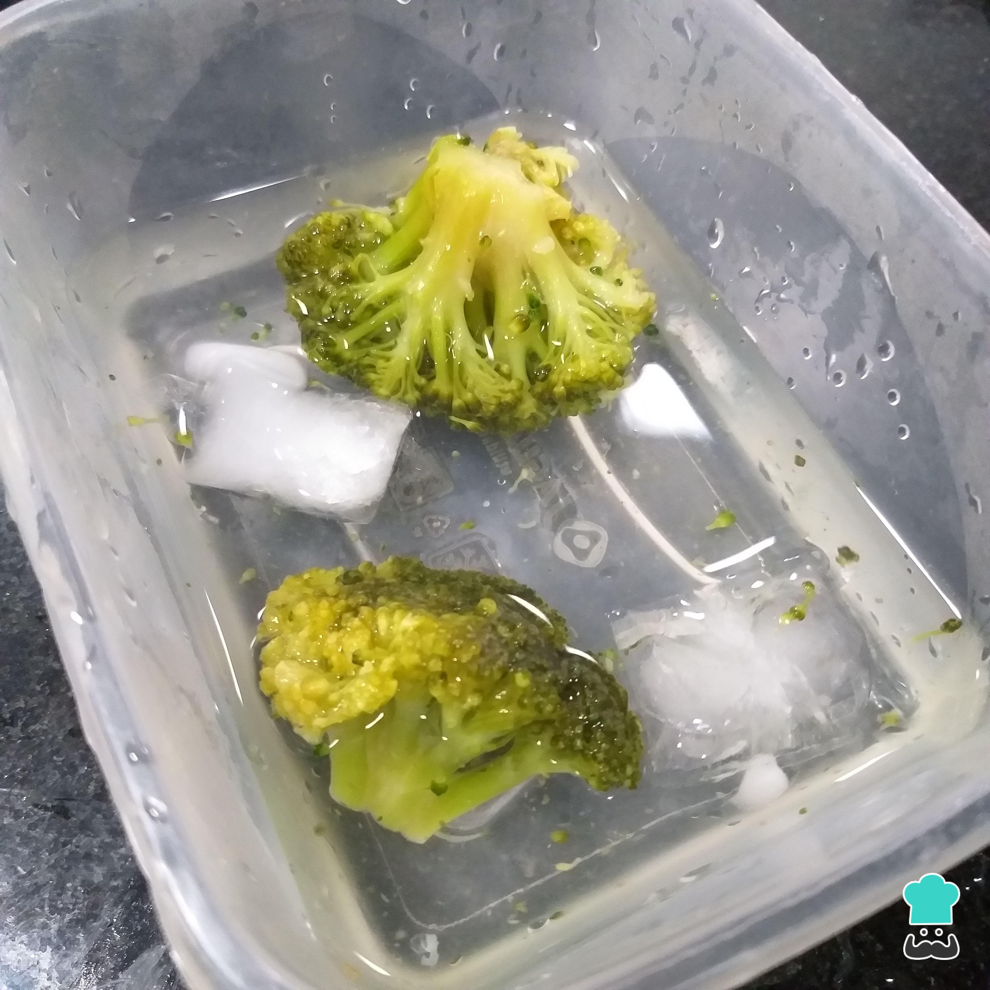 Após cozinhar os brócolis por 3 minutos, retire imediatamente e transfira para uma vasilha com água gelada, para parar o cozimento e conseguir o processo de branqueamento - isso fará com que o brócolis se mantenha verdinho e saboroso! Retire e seque bem os floretes de brócolis.