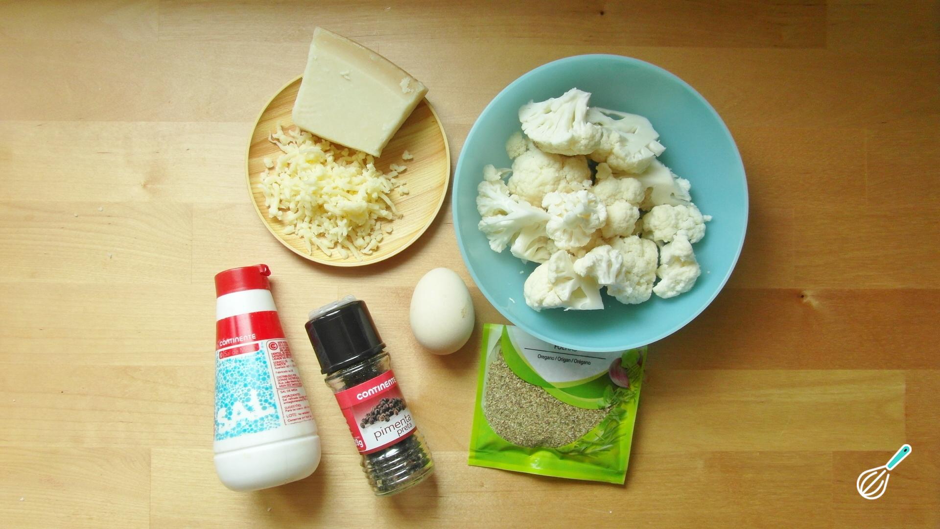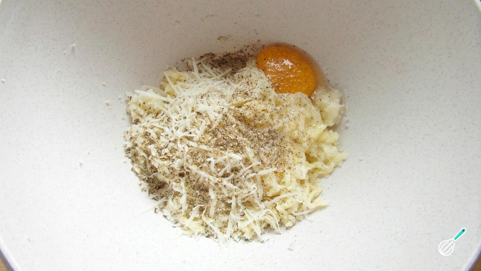 Coloque a couve-flor em uma tigela junto com os queijos, o ovo, o sal, a pimenta do reino e os oréganos. Misture muito bem, usando uma colher ou as mãos.