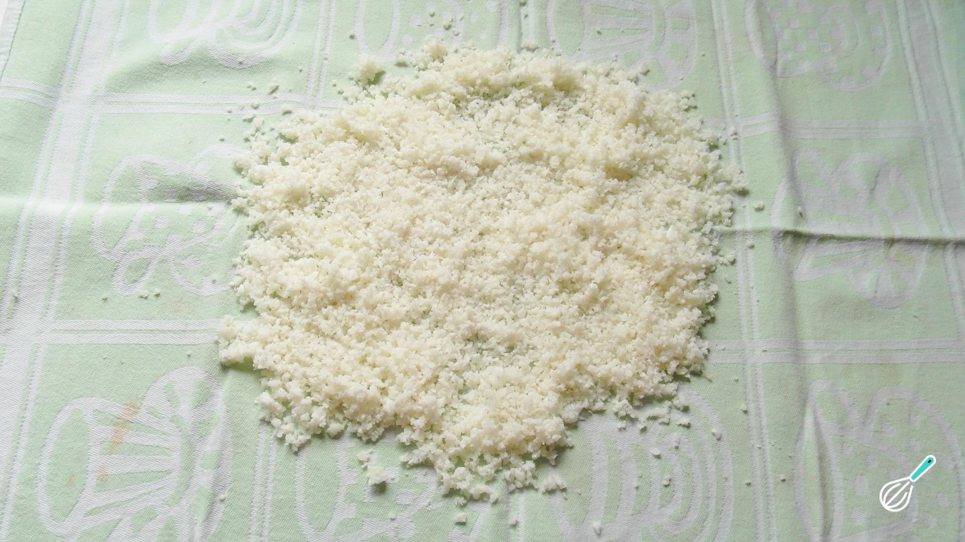 Corte a couve-flor em pedaços (rejeite o caule) e triture no liquidificador ou processador de alimentos. Para a cozinhar, cozinhe em um prato e leve ao microondas em potência máxima por 4 minutos. Deixe esfriar sobre um pano de cozinha.