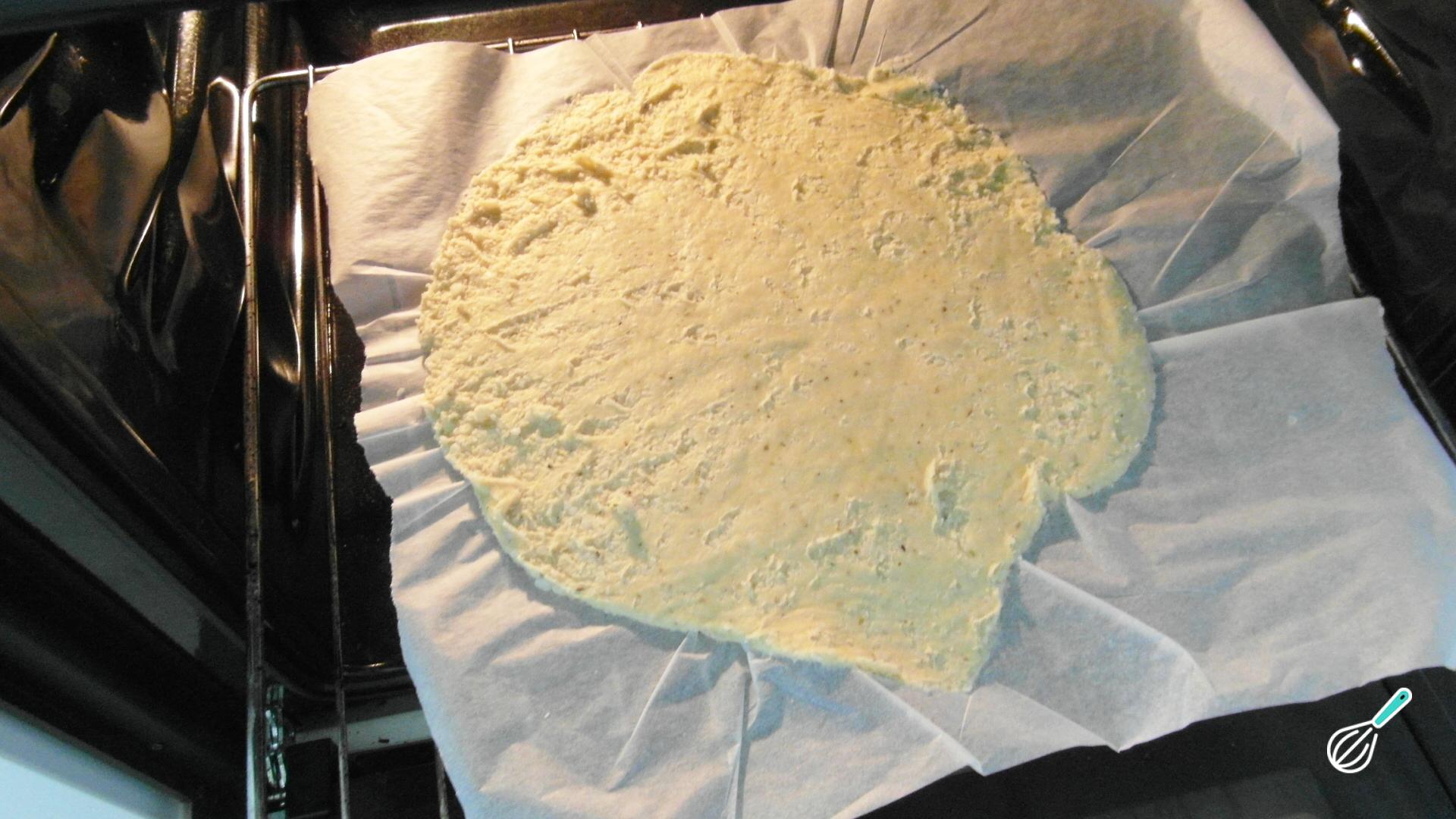 Retire o papel manteiga que está por cima e leve a massa a assar no forno preaquecido a 230ºC por 10 minutos, ou até dourar.
