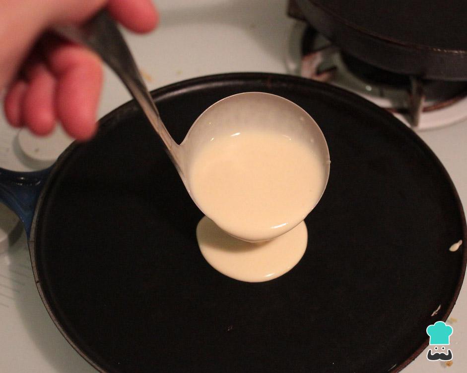Dica: você saberá que a frigideira está quente o suficiente quando começar a libertar uma pequena fumaça, por conta do óleo esquentando. Lembre que a massa deverá ficar mais fina que a massa de panqueca.
