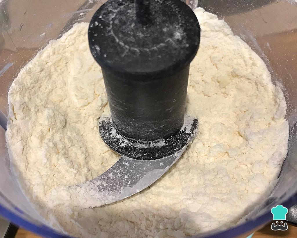Num processador ou numa tigela coloque a farinha, o sal e a manteiga gelada picada em cubos. Misture estes dois ingredientes do empadão de massa podre, até obter uma consistência tipo areia.