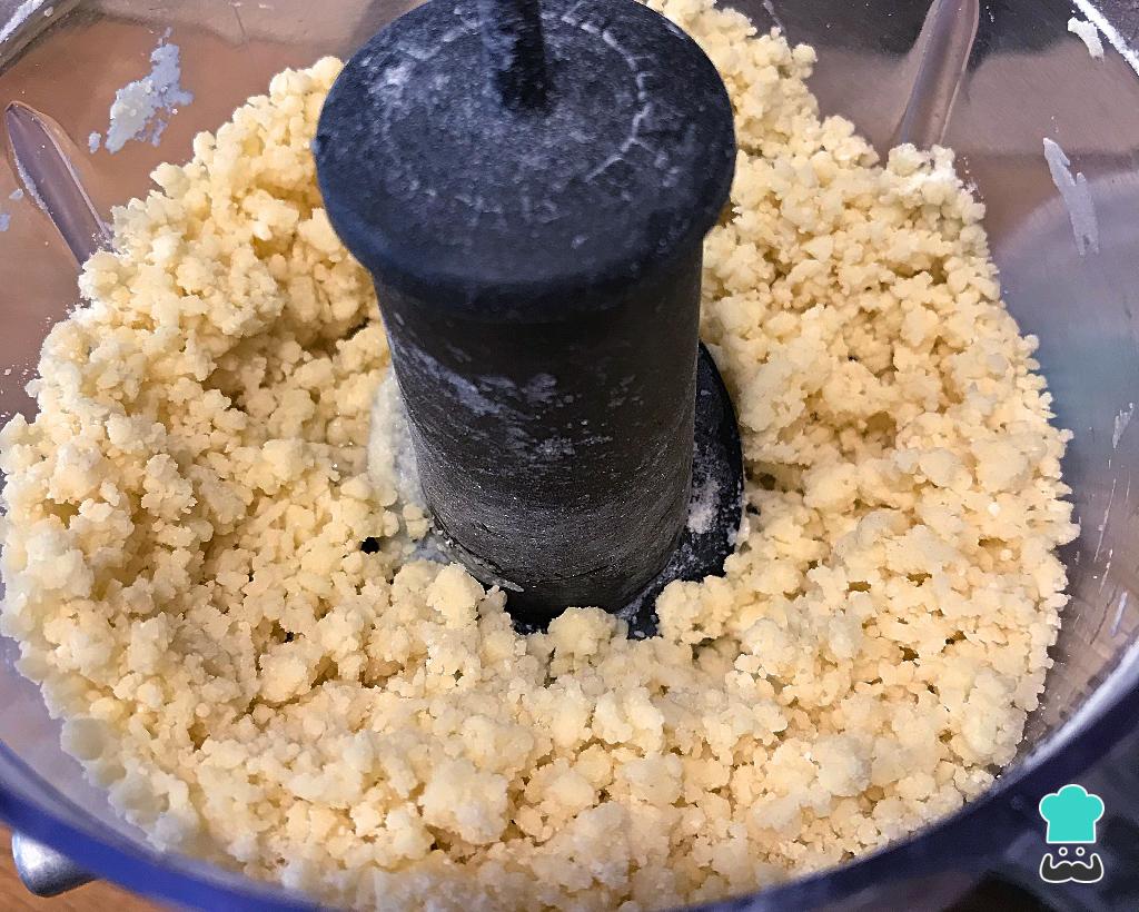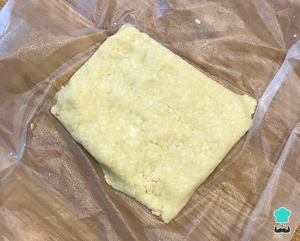 A consistência da massa é firme, porém esfarelando quando você separa um pedaço. Amasse um pouco, para misturar bem os ingredientes, e embrulhe num papel filme. Reserve na geladeira por 20-30 minutos.