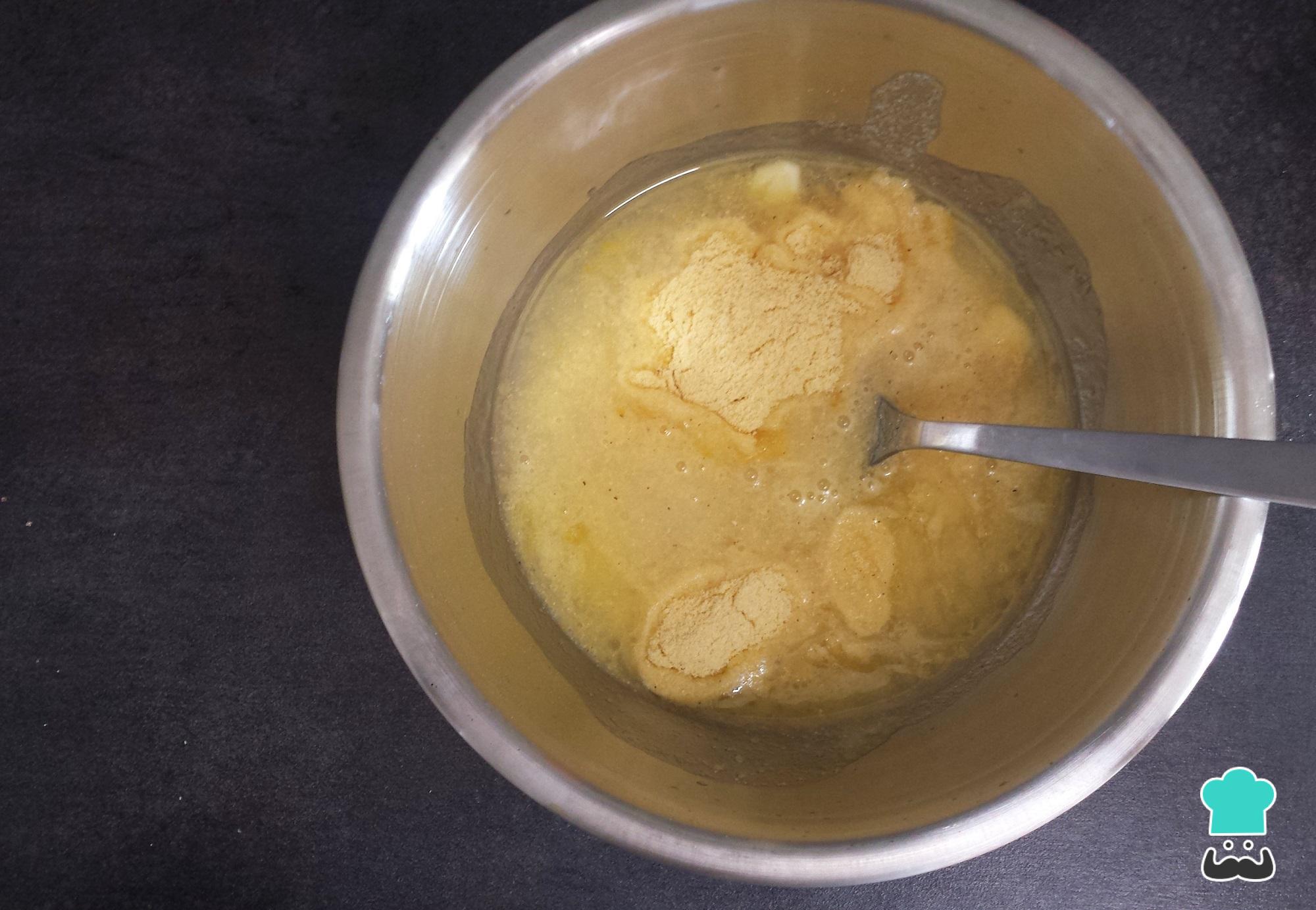 O primeiro passo dessa receita de massa de milho para gorditas é misturar em uma tigela a farinha de milho com a de trigo e o sal. Dissolva o fermento e o bicarbonato com meia xícara de água e adicione às farinhas.