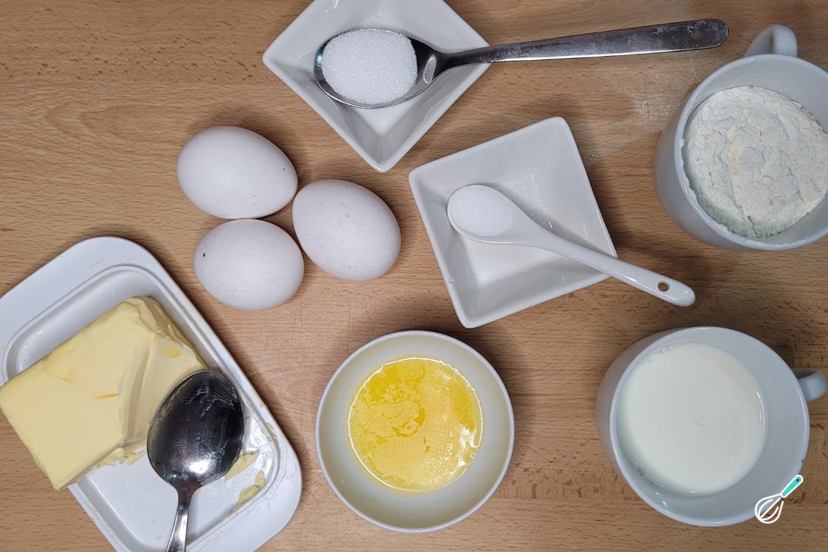 Separe os ingredientes para fazer sua massa de panqueca simples de liquidificador. Você pode ajustar a quantidade de açúcar conforme sua preferência caso esteja fazendo uma panqueca doce ou até mesmo omitir o açúcar, se preferir.