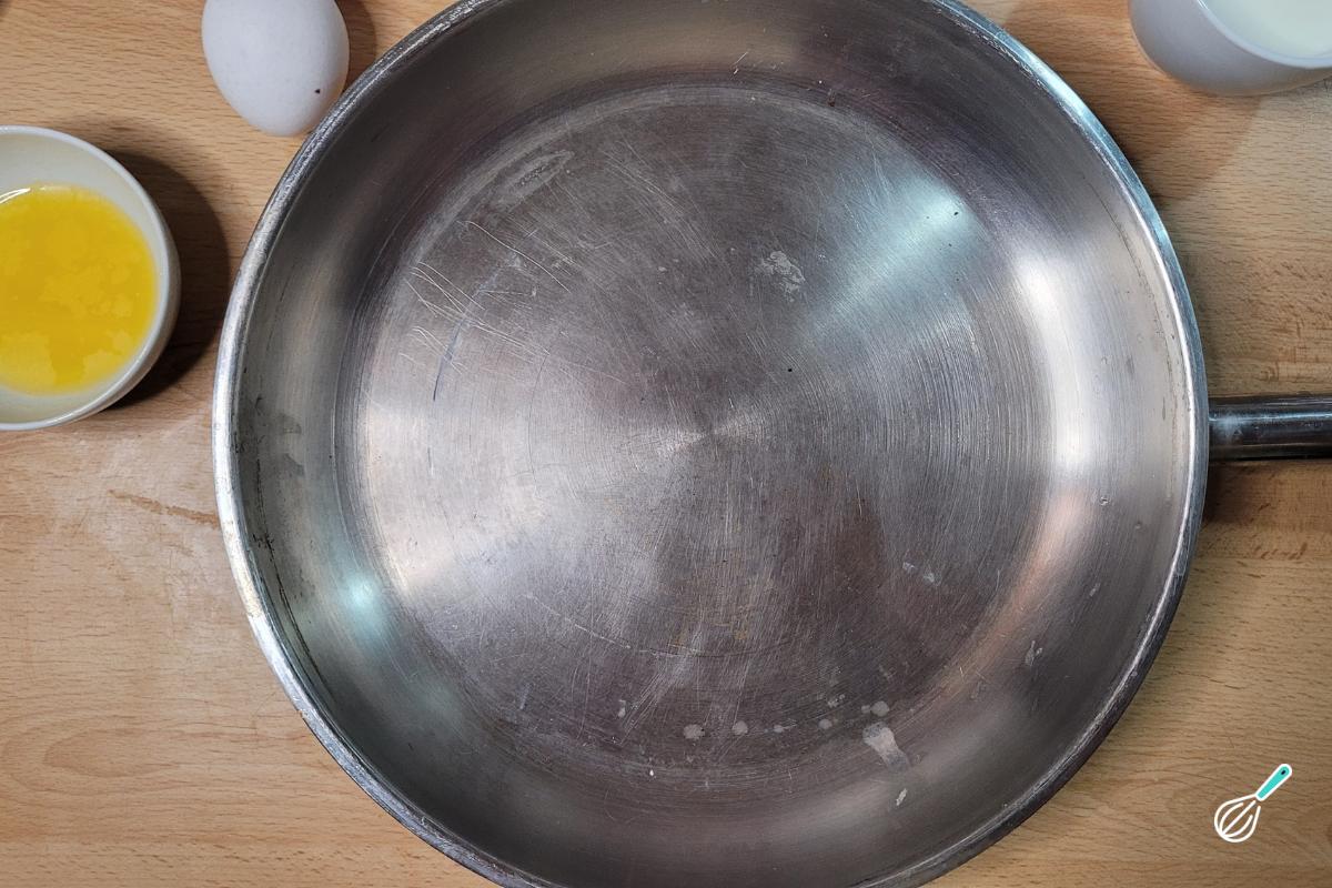 Tradicionalmente, essa massa é assada em uma frigideira de ferro ou material que possa ir ao forno. Se não tiver, pode usar uma assadeira, mas dê preferência a um material que mantenha bem o calor. Depois que a frigideira aquecer, abra o forno, coloque as 3 colheres de sopa de manteiga para untar a frigideira e volte para o forno para que a manteiga derreta antes de colocar a massa.