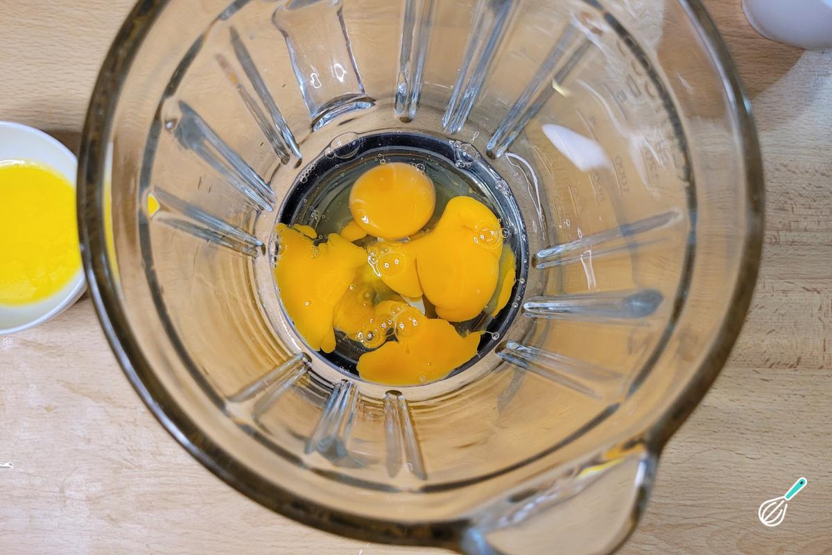 Para a massa, no liqudificador, coloque os ovos.