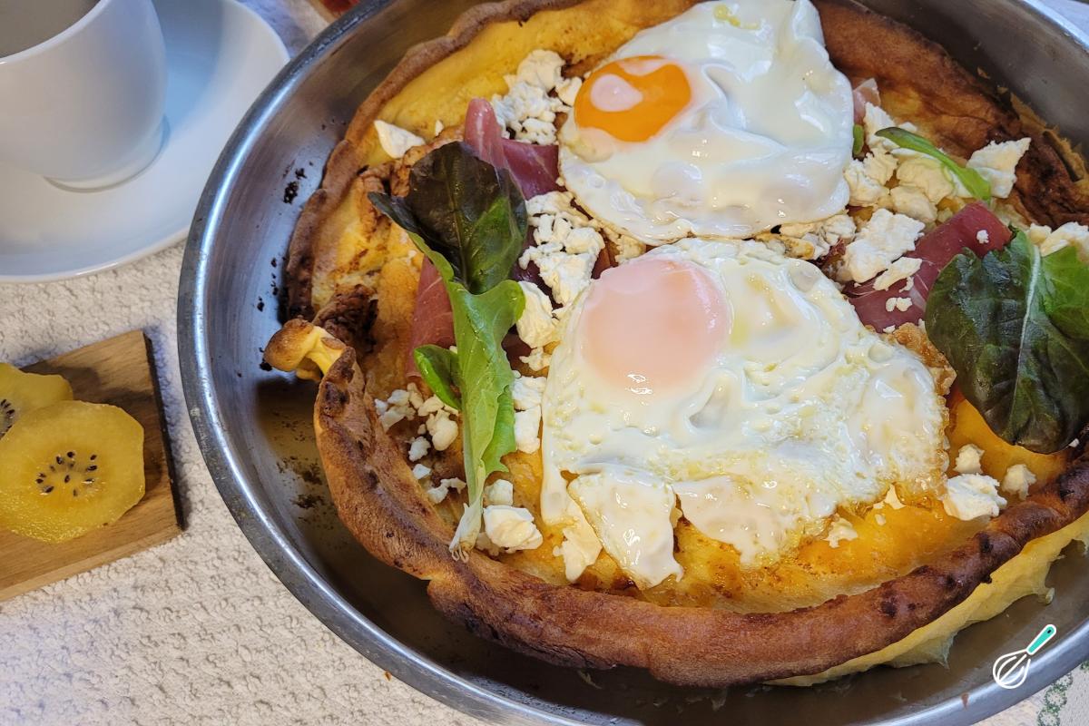 Apesar de levar um pouquinho de açúcar, ela é super neutra e por isso é versátil o suficiente para servir com toppings doces ou salgados. Aqui servimos com fatias de presunto parma, queijo feta esfarelado e ovos.