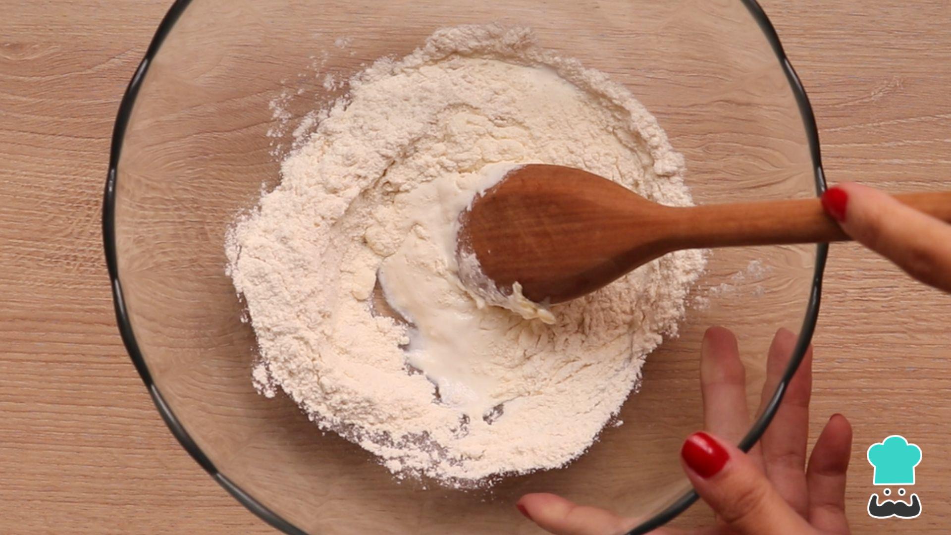 Em uma tigela misture o creme de leite, o sal e metade da farinha de trigo com uma colher.