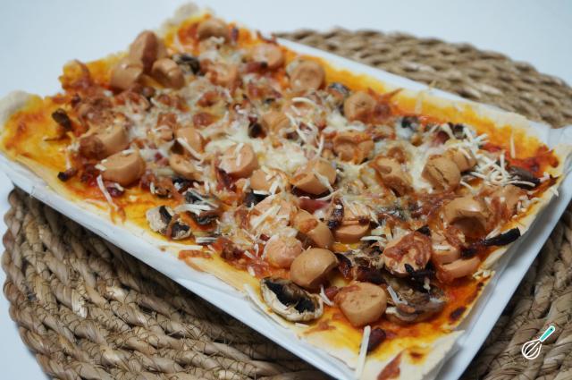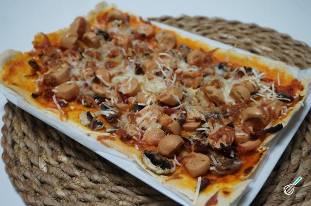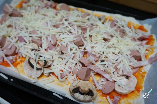 Dica: Na cobertura da minha pizza usei salsicha, cogumelos, bacon e mozarela. No entanto, se você quiser preparar uma pizza vegana, substitua a salsicha, o bacon e a mozarela por ingredientes vegetais.