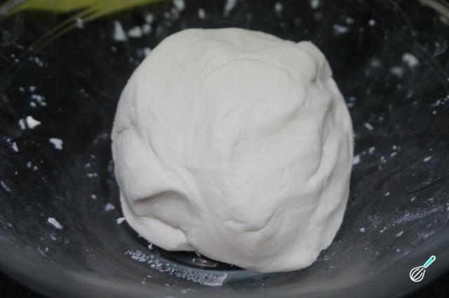 Amasse muito bem por uns 10 minutos, até obter uma massa com liga e lisinha que conseguirá modelar em forma de bola, como na foto. Deixe a massa descansar por 15 minutos.