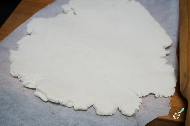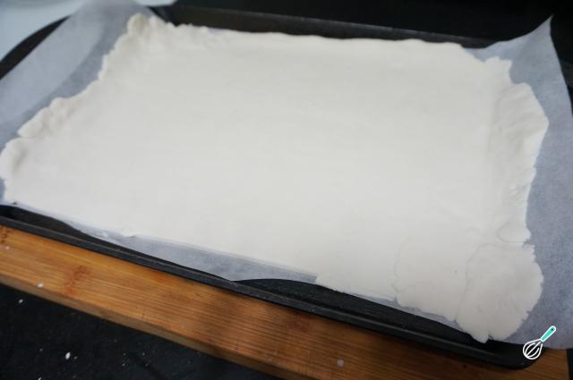 Dica: Usar o papel manteiga é imprescindível para conseguir abrir a massa e transferi-la sem quebrar para a bandeja de forno.