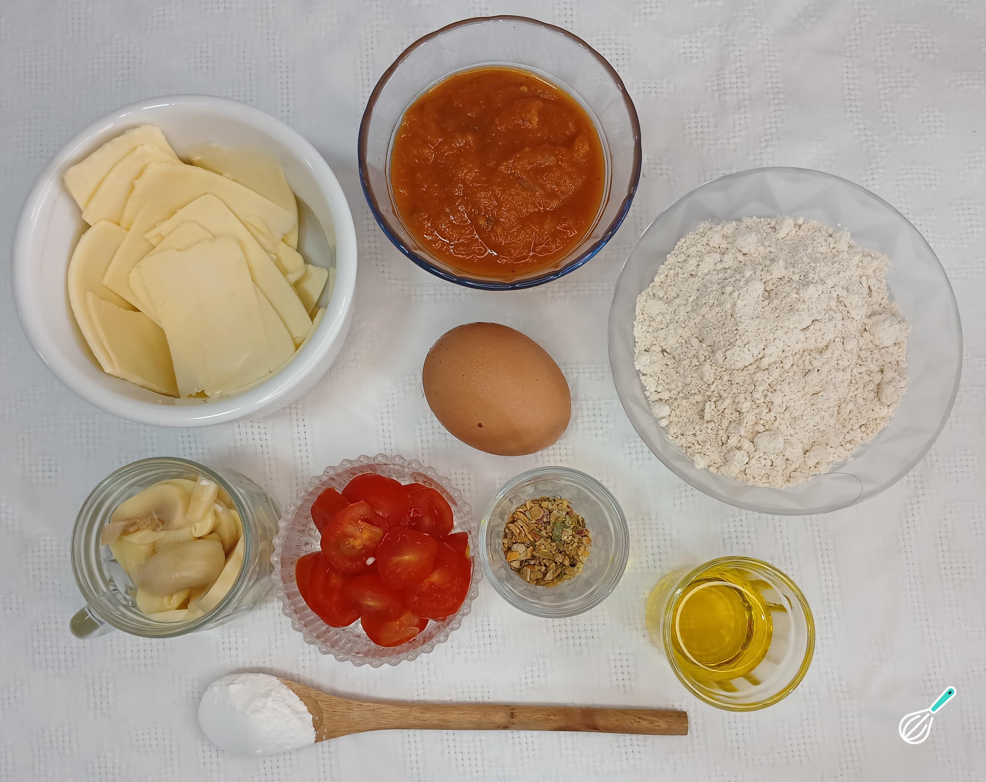 Comece separando os ingredientes para a massa de pizza com farinha de aveia. Separe a farinha de aveia, o ovo, o fermento químico e o sal. O recheio é de sua preferência, o que indicamos aqui é somente uma sugestão.