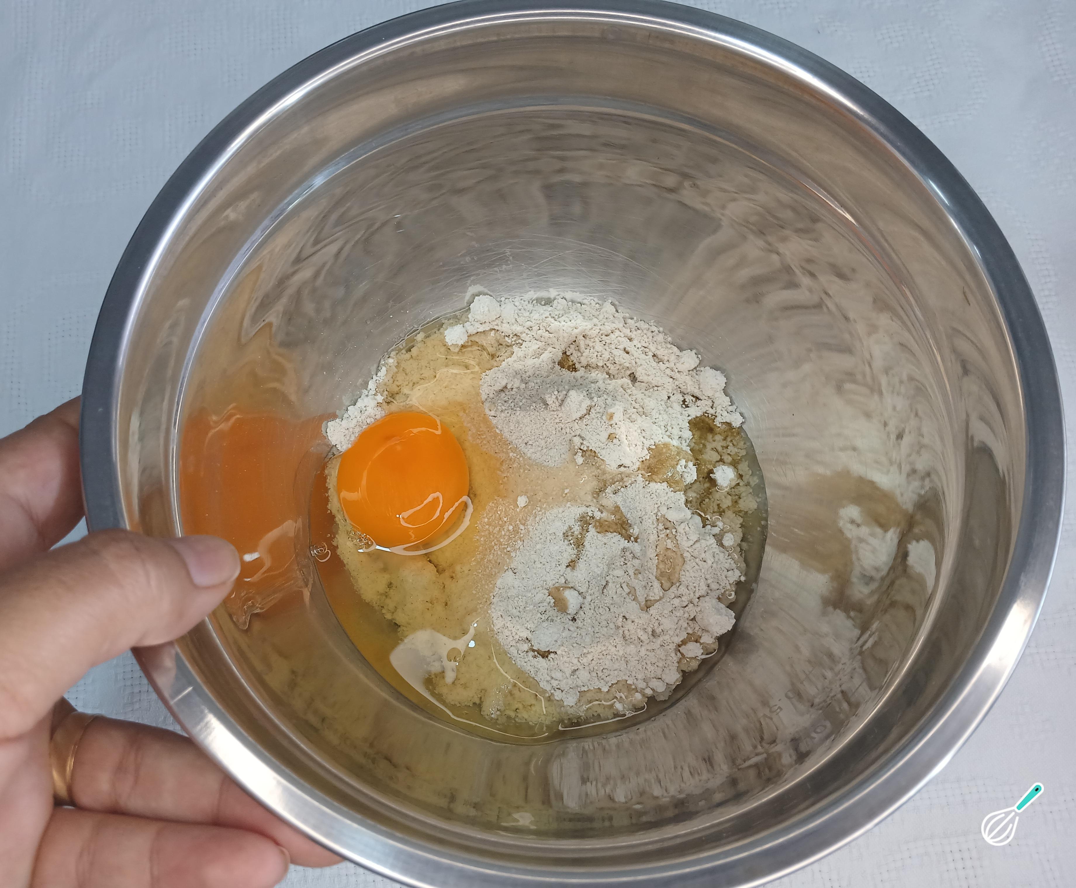 Em um bowl, coloque o ovo, o sal,o azeite e uma parte da farinha de aveia. Misture tudo muito bem. Use uma colher de sopa ou de silicone.
