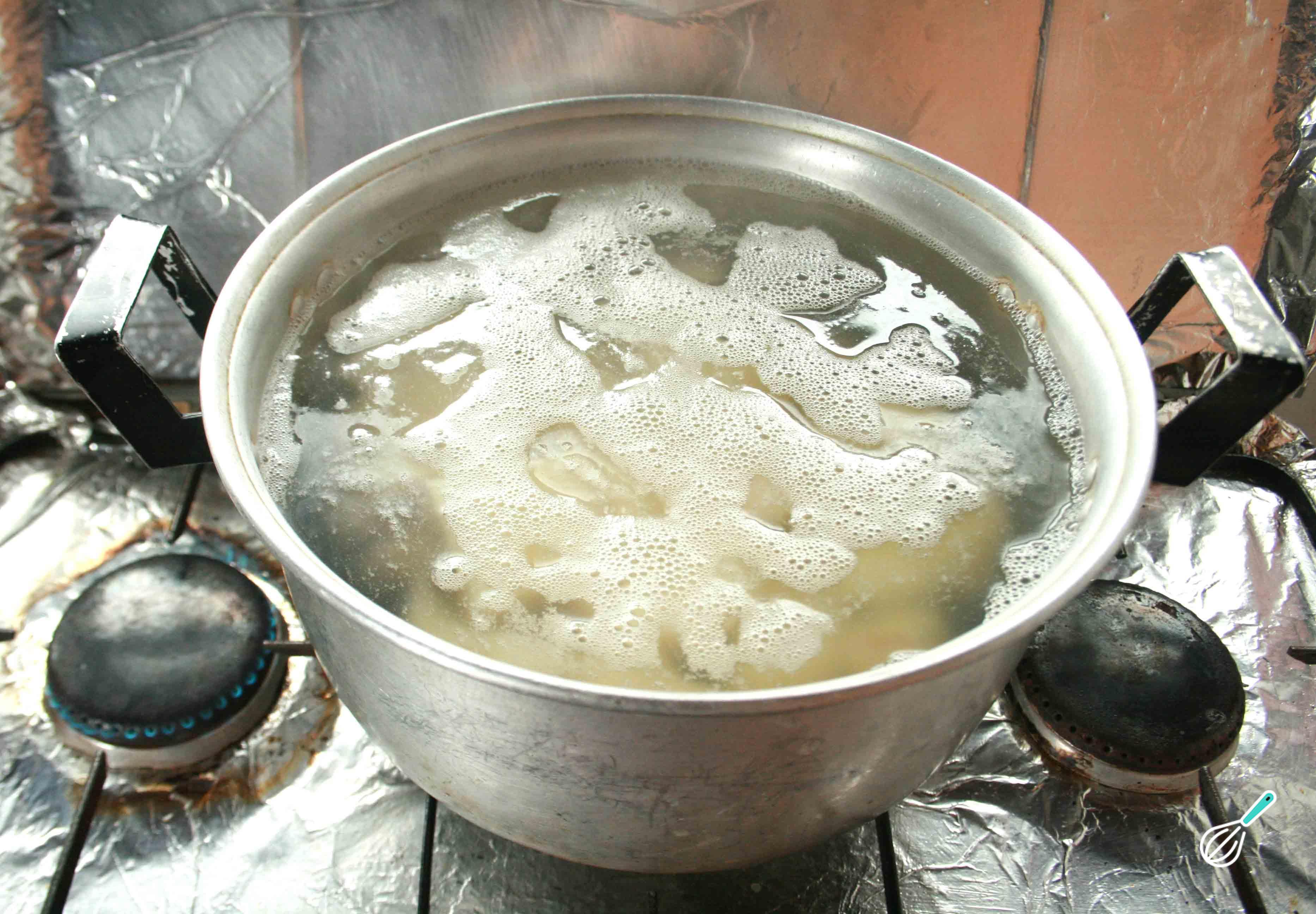 Lave e corte a mandioca em pedaços médios. Numa panela esquente água em quantidade suficiente para cozer a mandioca e adicione-a quando estiver fervendo.