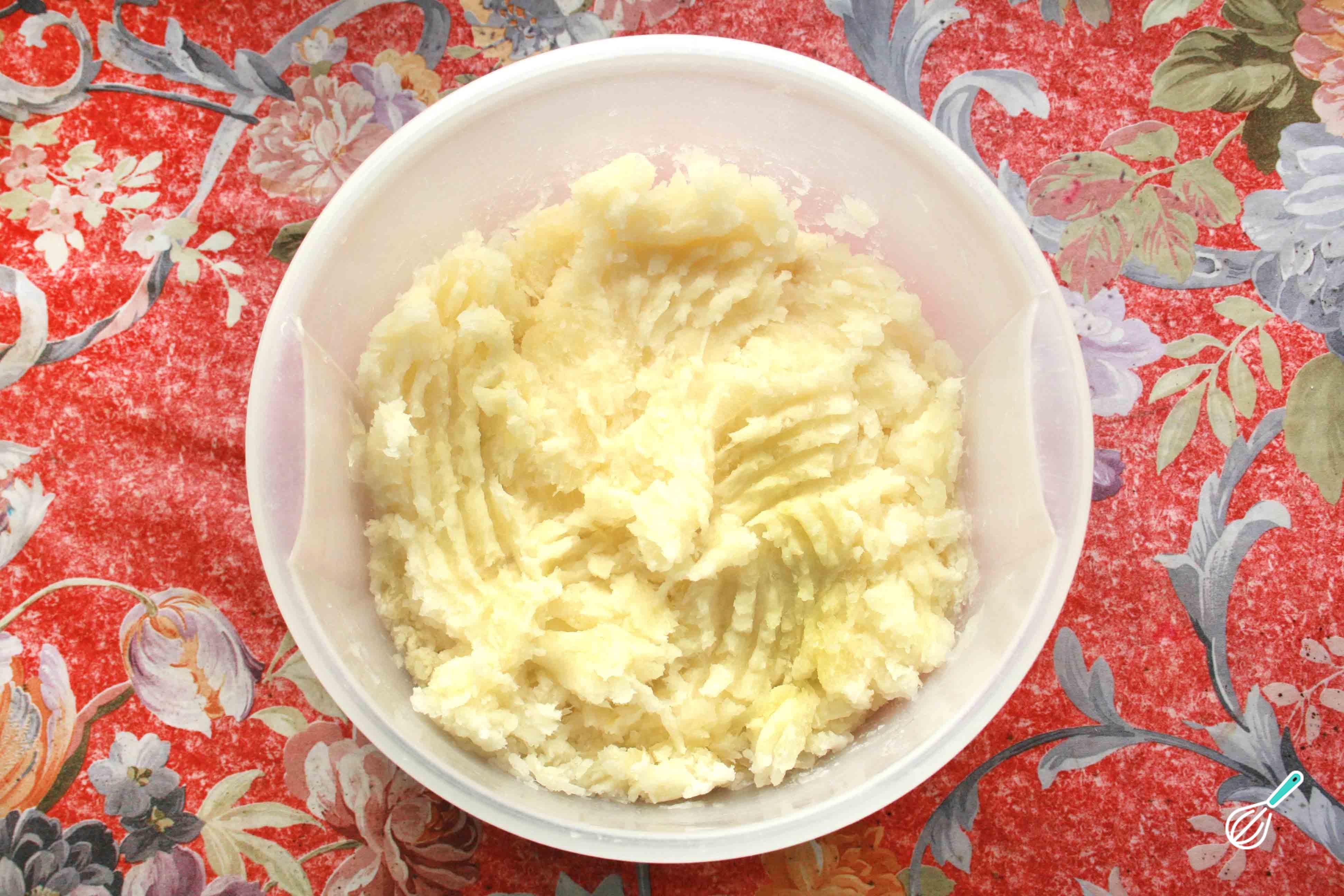 O passo seguinte desta receita de massa de pizza com mandioca cozida é reduzir a mandioca a purê, com a ajuda de um garfo ou de um utensílio próprio.