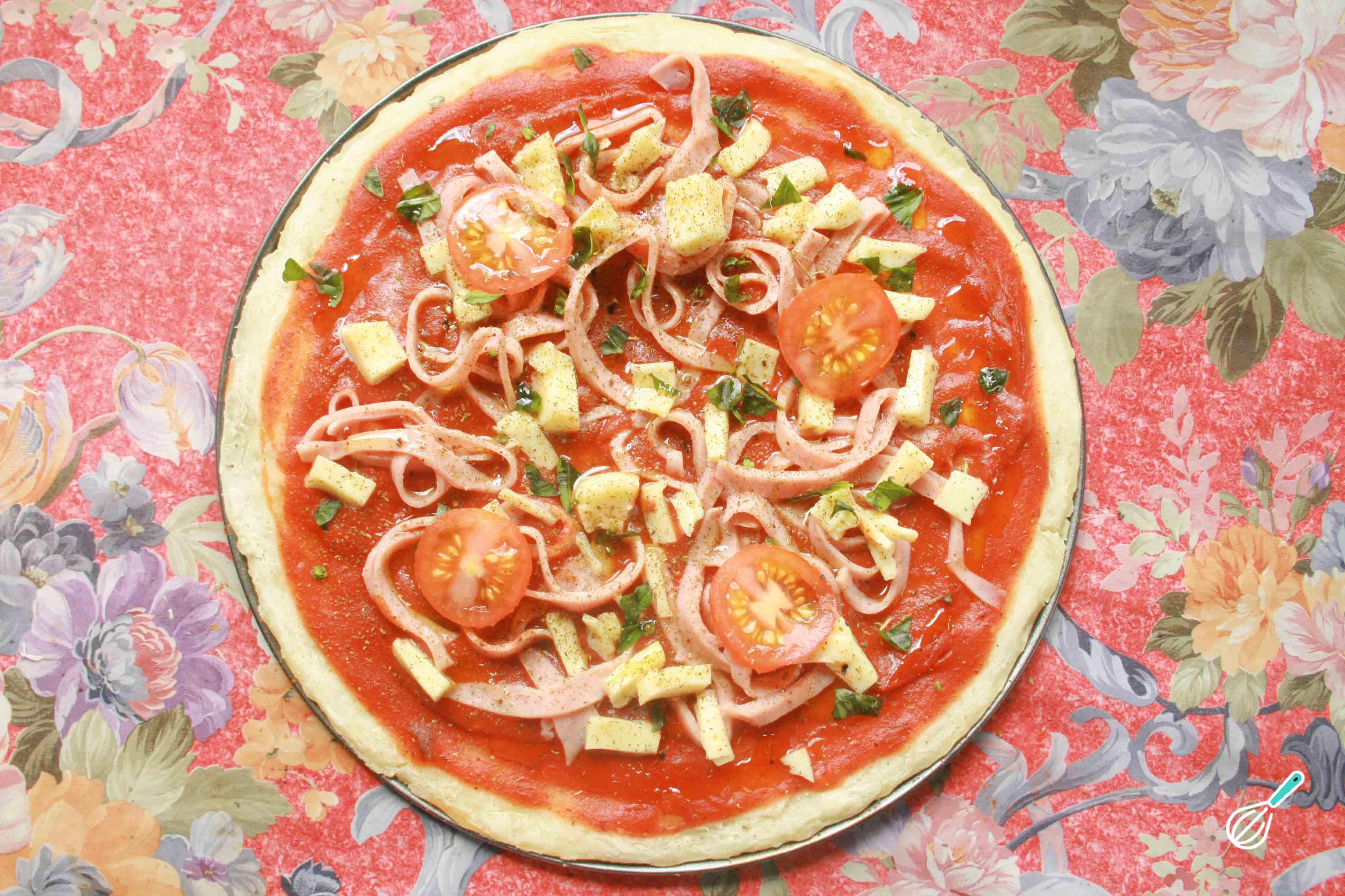 Agora chega a parte mais divertida: rechear a pizza com ingredientes a gosto! Use seus ingredientes preferidos ou aproveite para esvaziar o frigorífico. Não se esqueça que uma pizza com queijo é sempre mais gostosa! Devolva ao forno até ficar douradinha.
